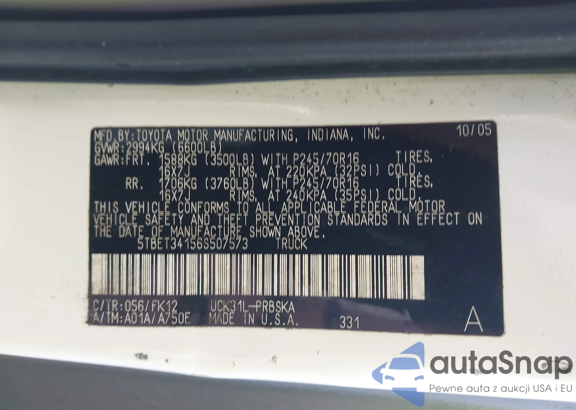 • VIN 5TBET34156S507573
