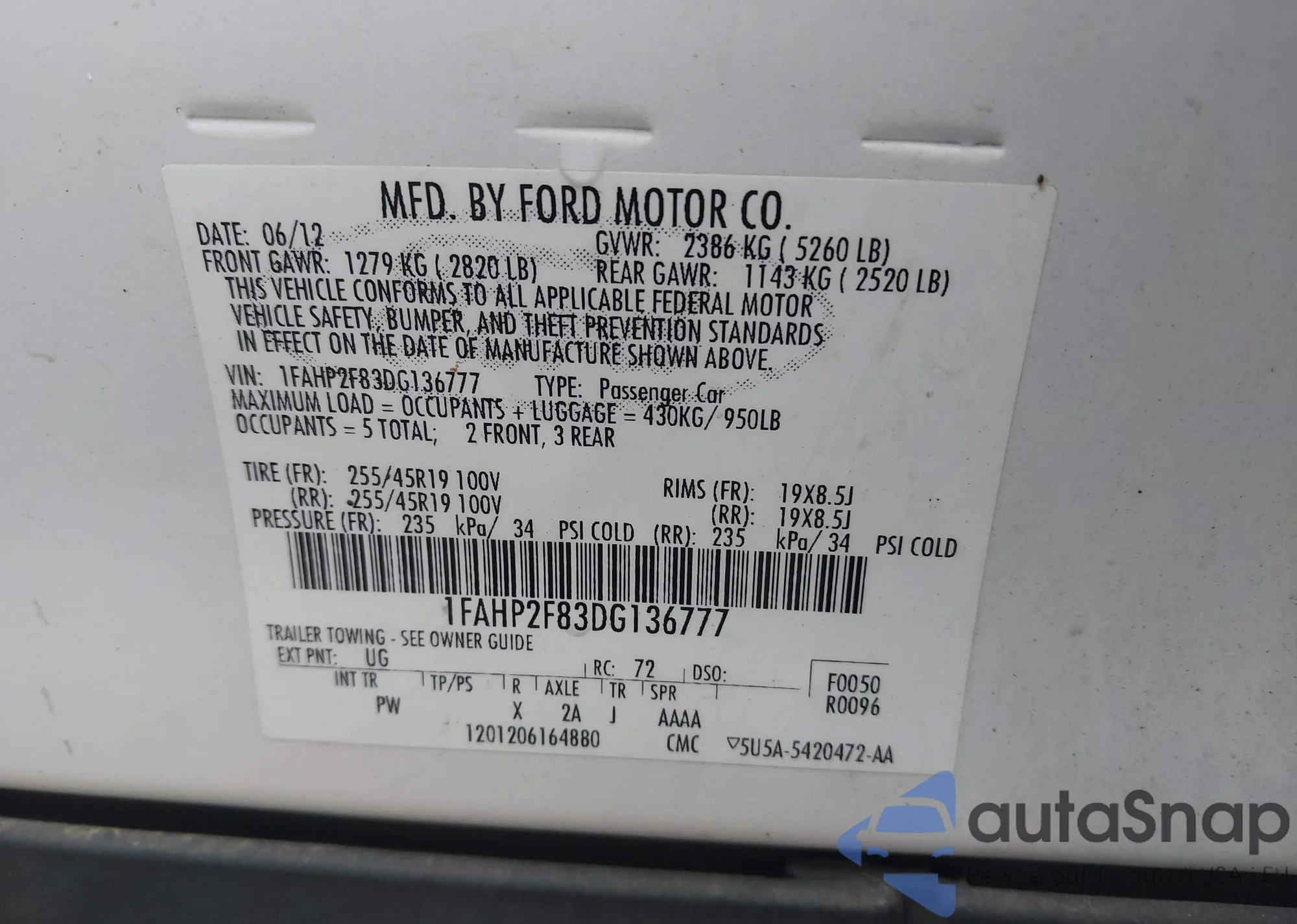 LOT: 43202011 VIN: 1FAHP2F83DG136777