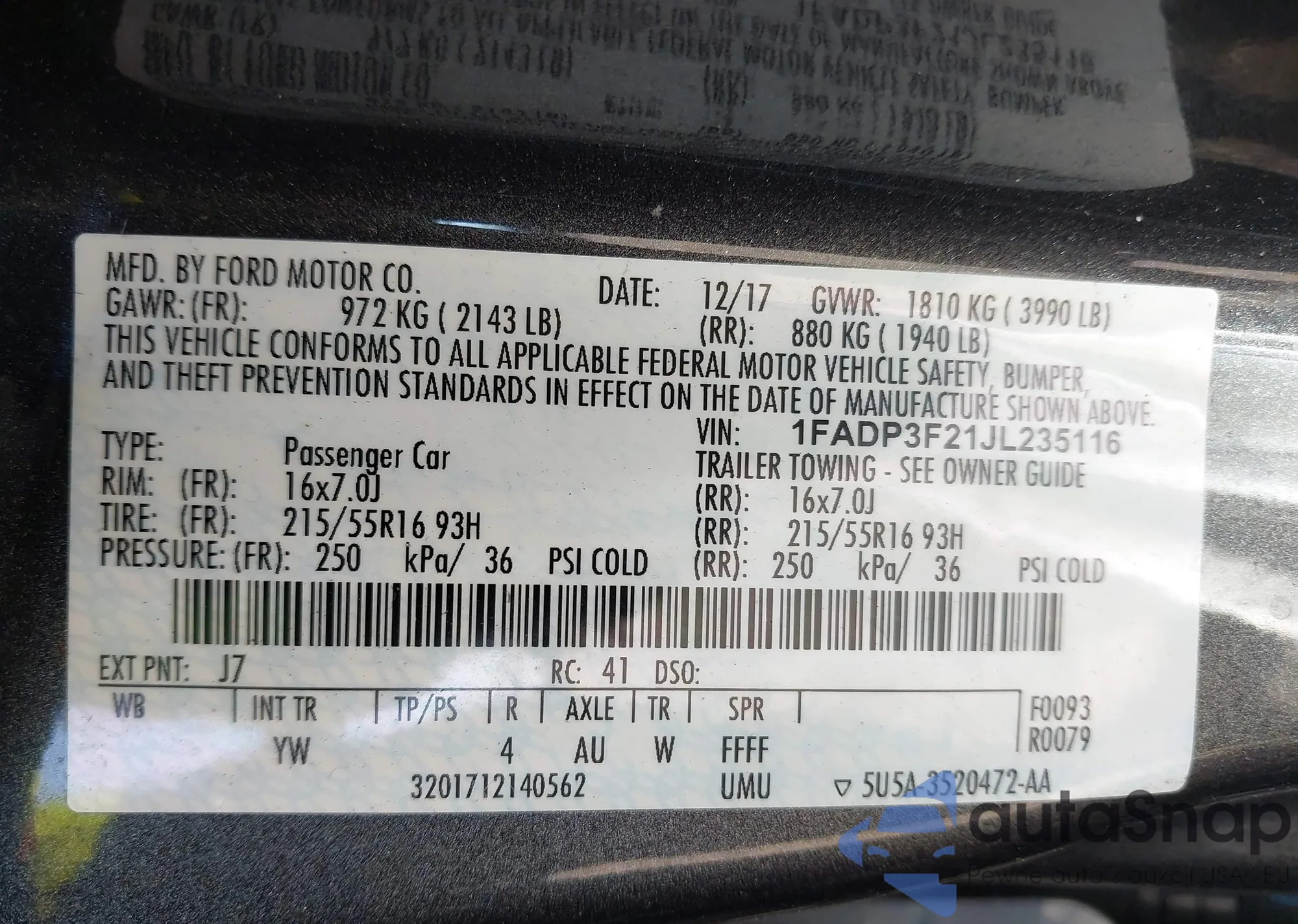 LOT: 43367471 VIN: 1FADP3F21JL235116