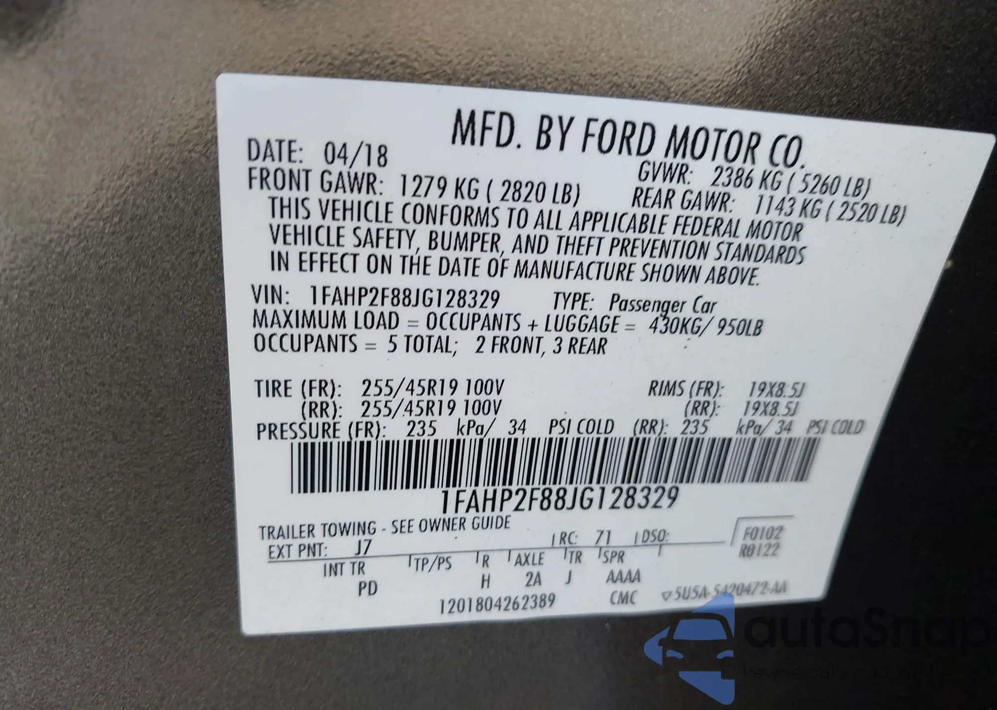 LOT: 43372183 VIN: 1FAHP2F88JG128329