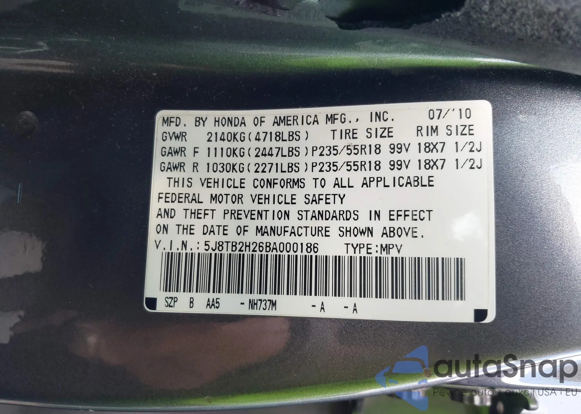 • VIN 5J8TB2H26BA000186