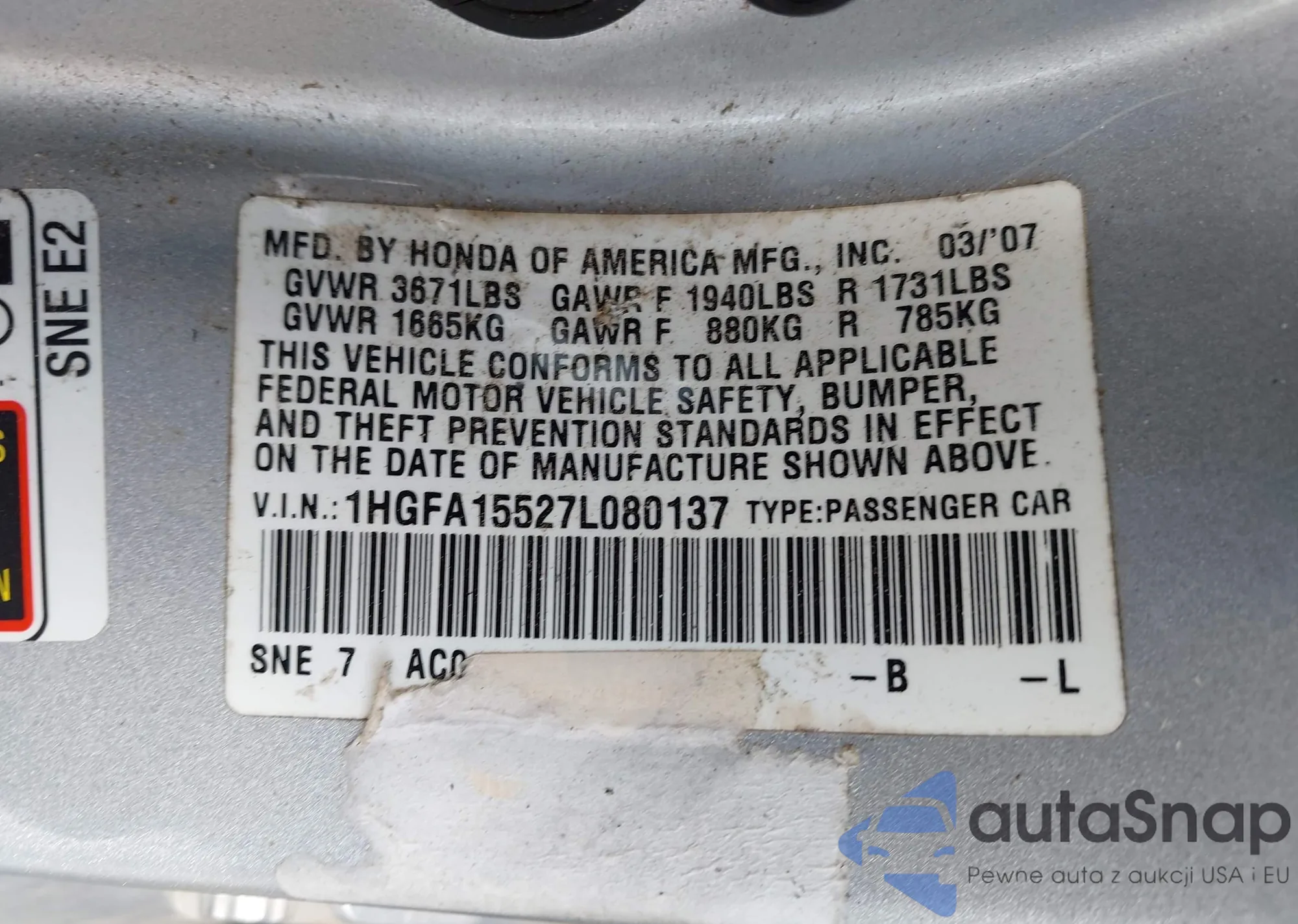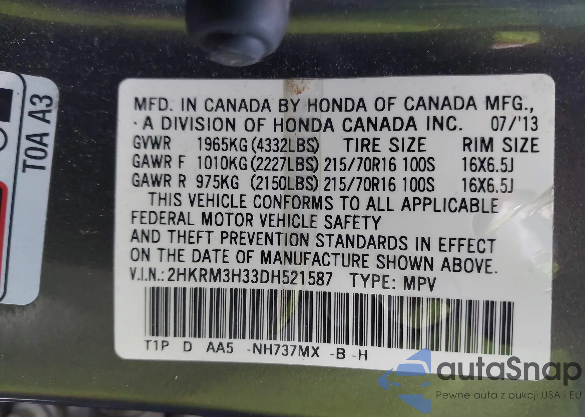 • VIN 2HKRM3H33DH521587