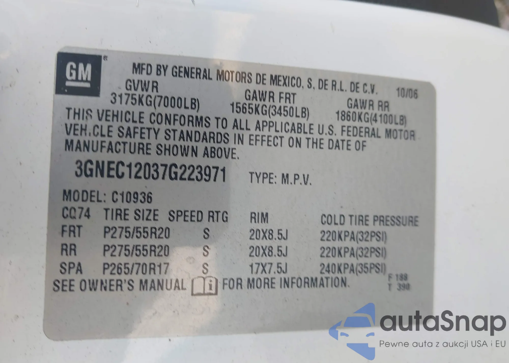 • VIN 5UX53GP05S9Z45003