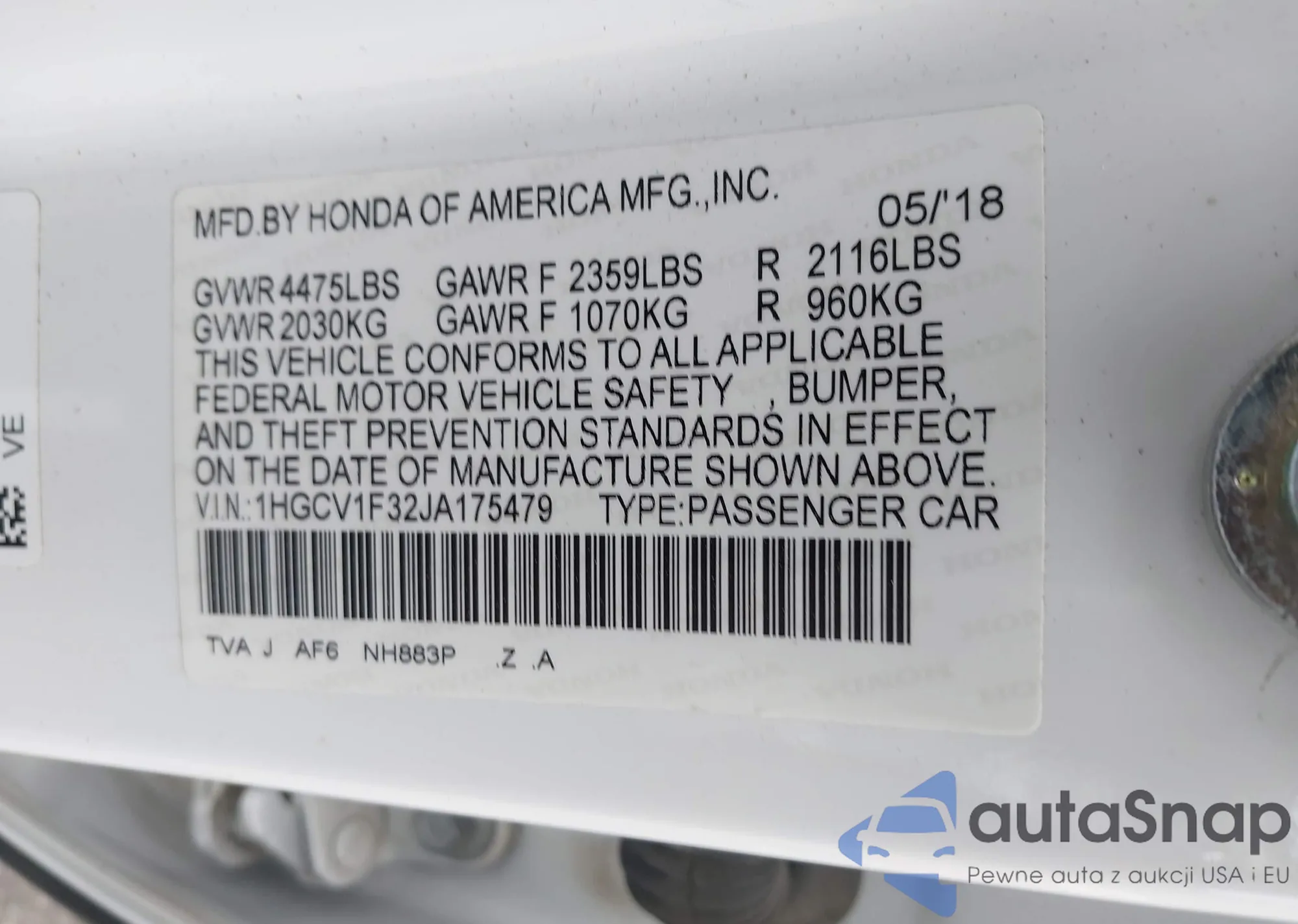 LOT: 43147207 VIN: 1HGCV2F39JA016271