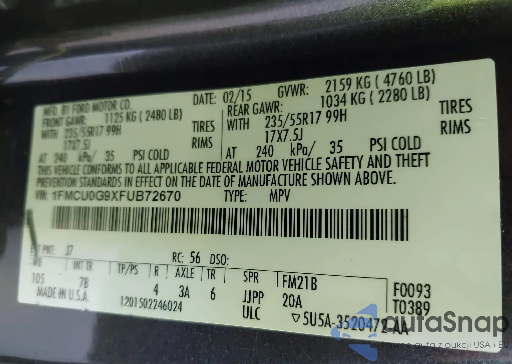 LOT: 43037821 VIN: 1FMCU0G9XFUB72670