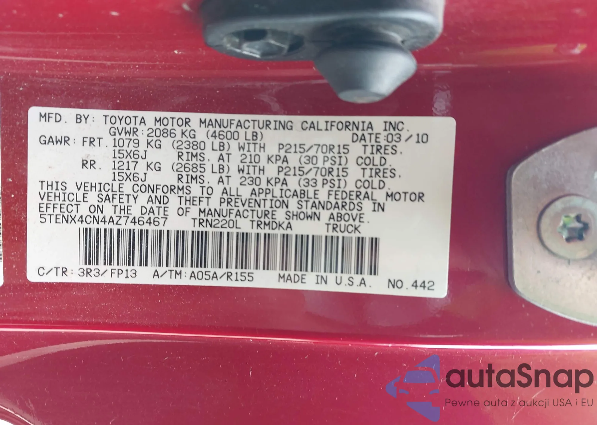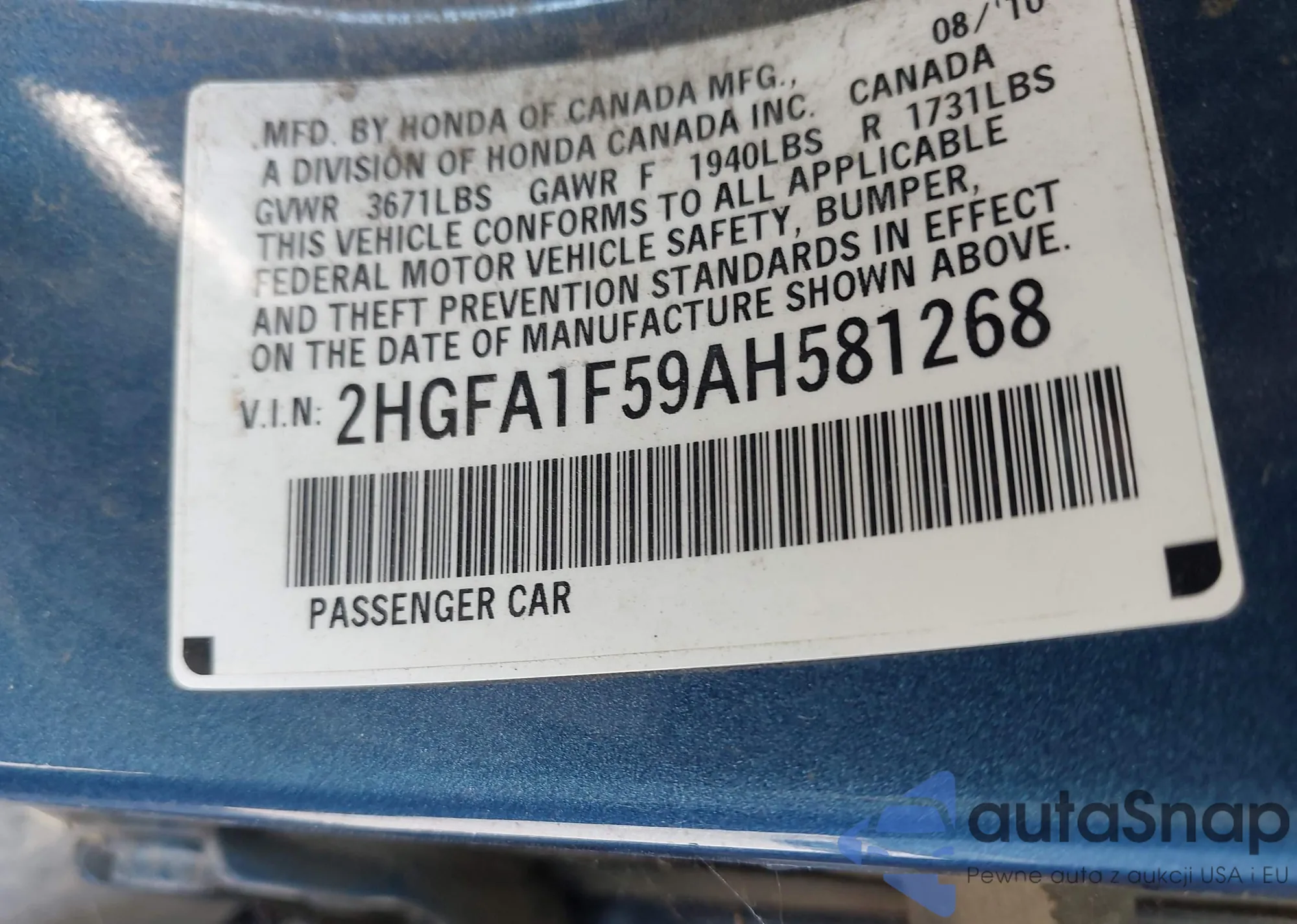 • VIN 2HGFA1F59AH581268