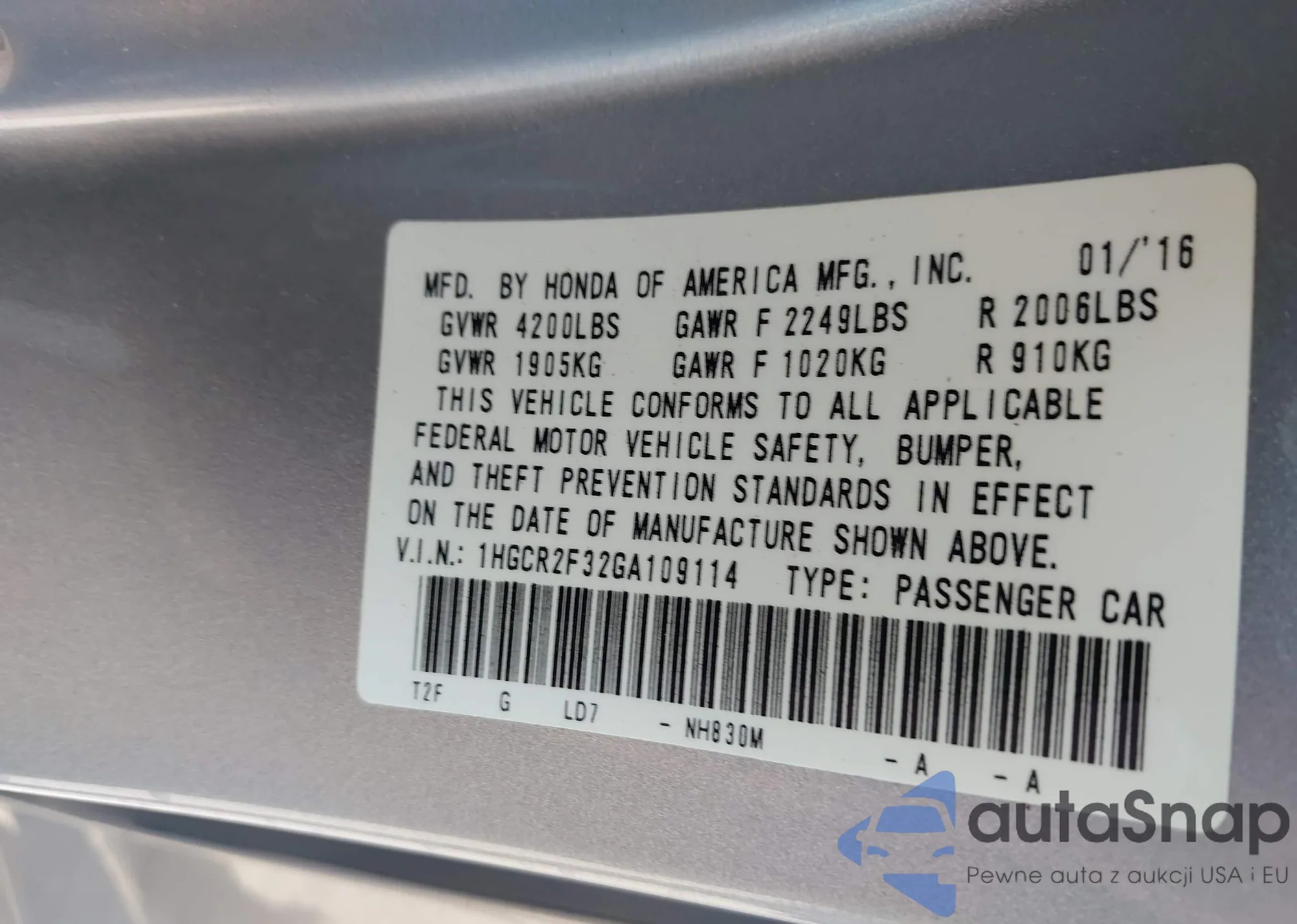 LOT: 43136353 VIN: 1HGCR2F32GA109114