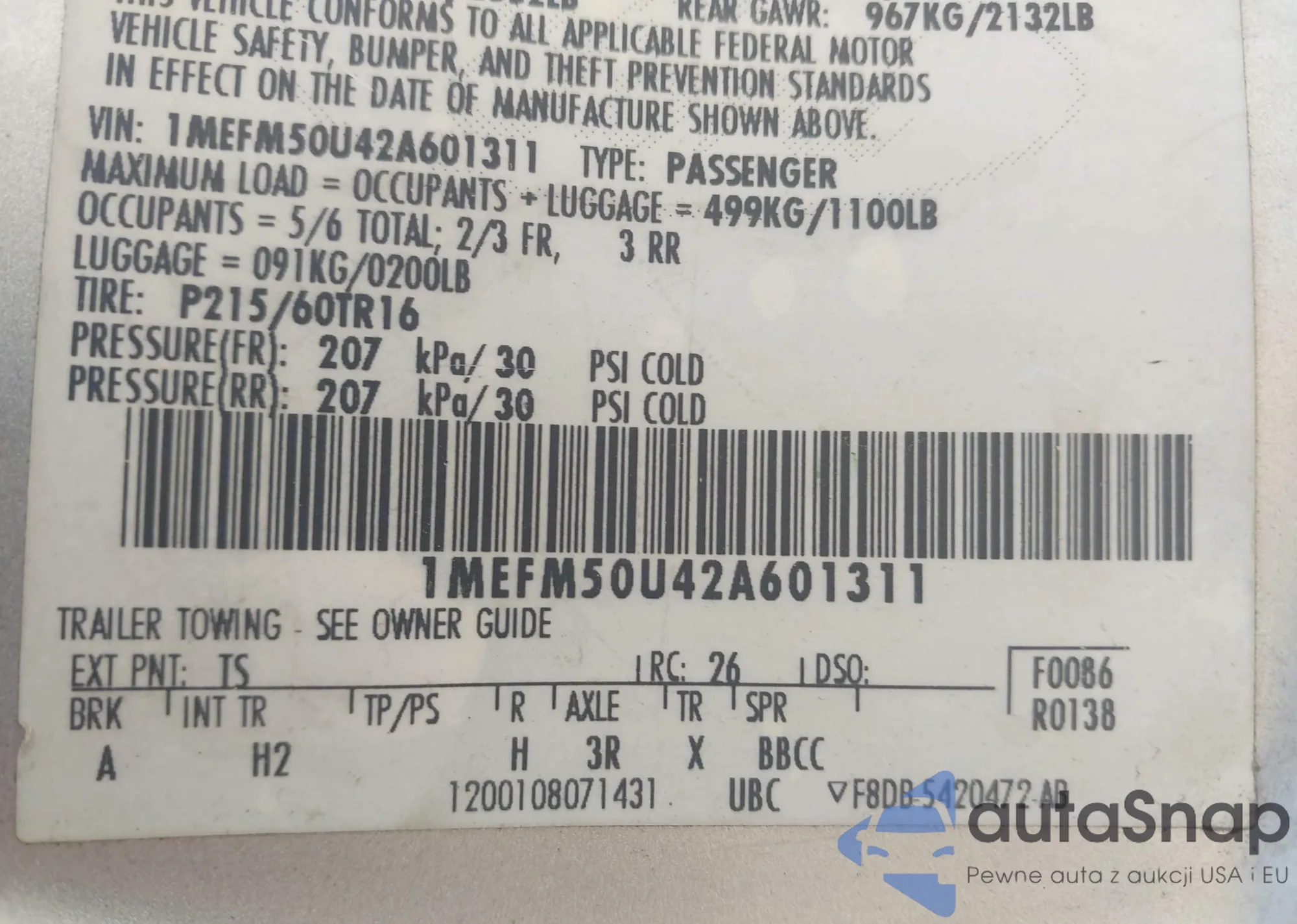 • VIN 1HGCP2F86AA005489