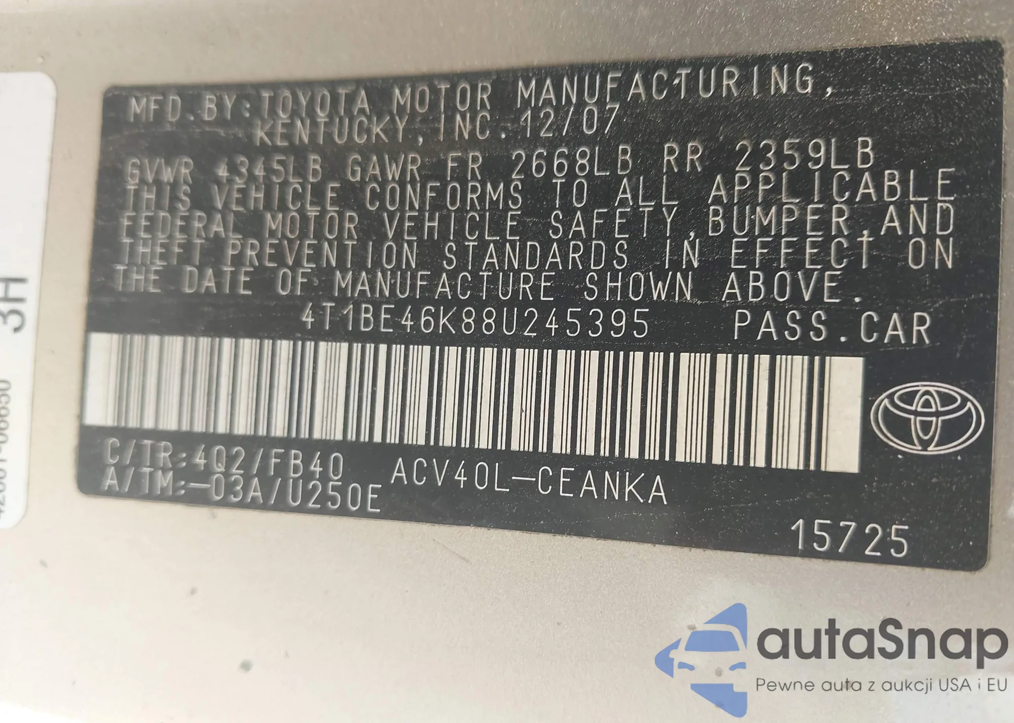 LOT: 43296372 VIN: 4T1BE46K88U245395