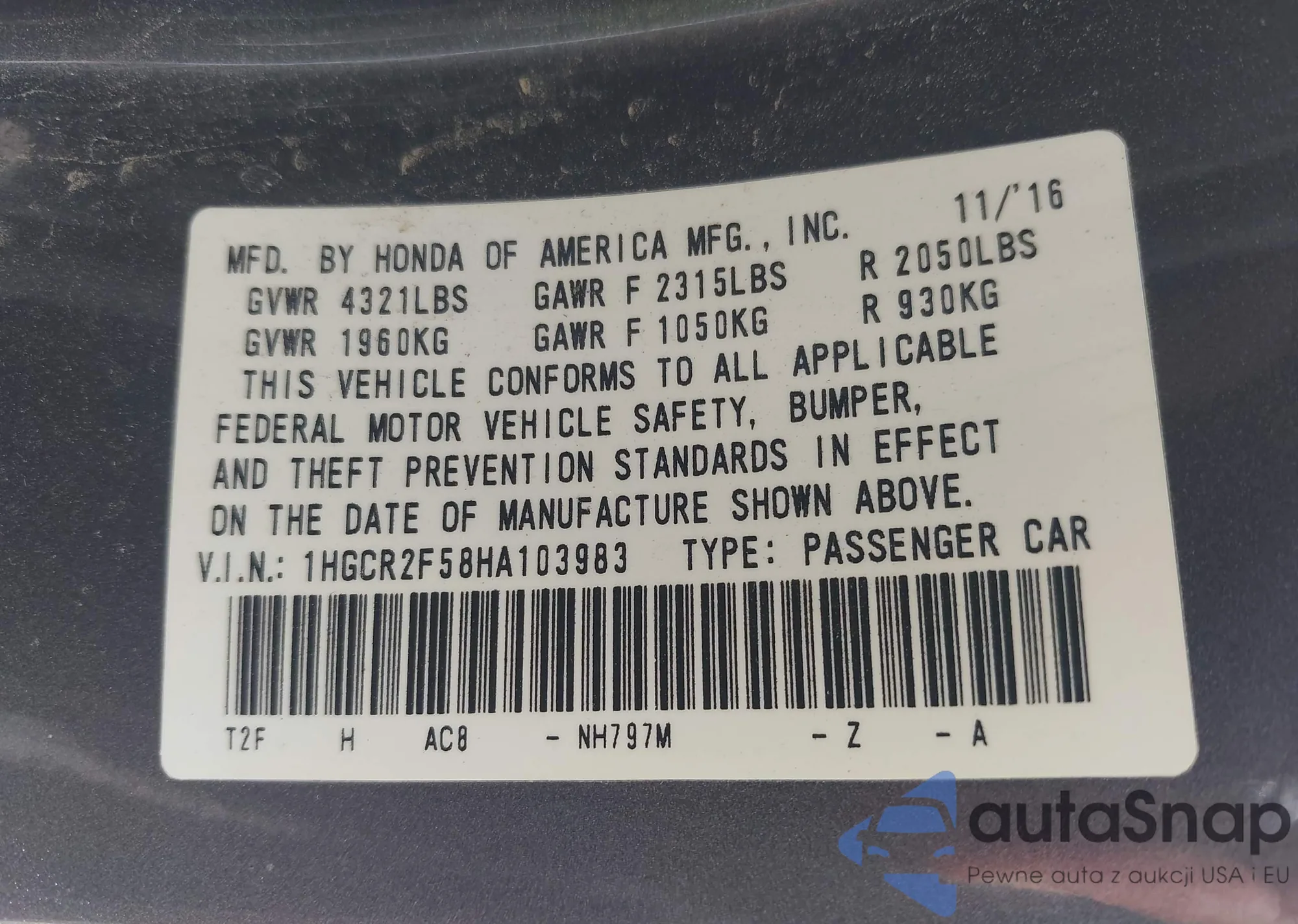 LOT: 43308204 VIN: 1HGCR2F58HA103983