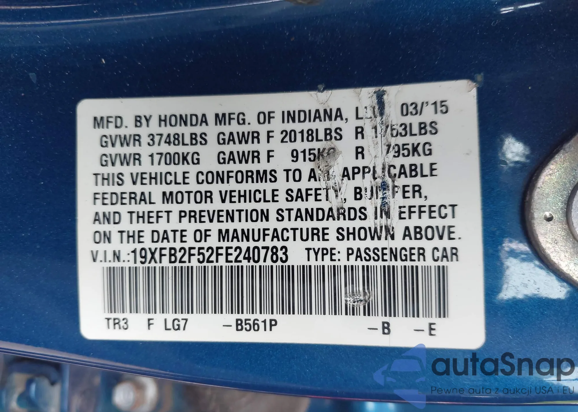 LOT: 41476415 VIN: 2HGFB2F59DH528755