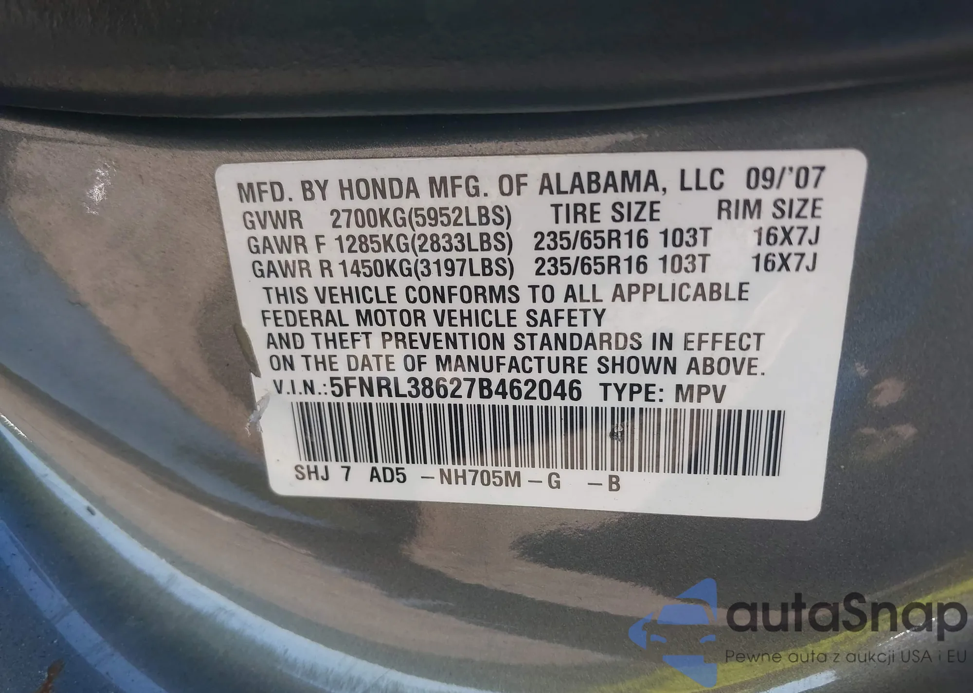 • VIN 5FNRL38627B462046
