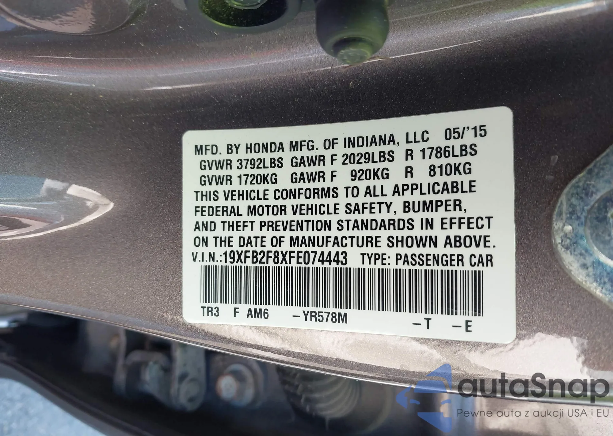LOT: 43304193 VIN: 19XFB2F8XFE074443