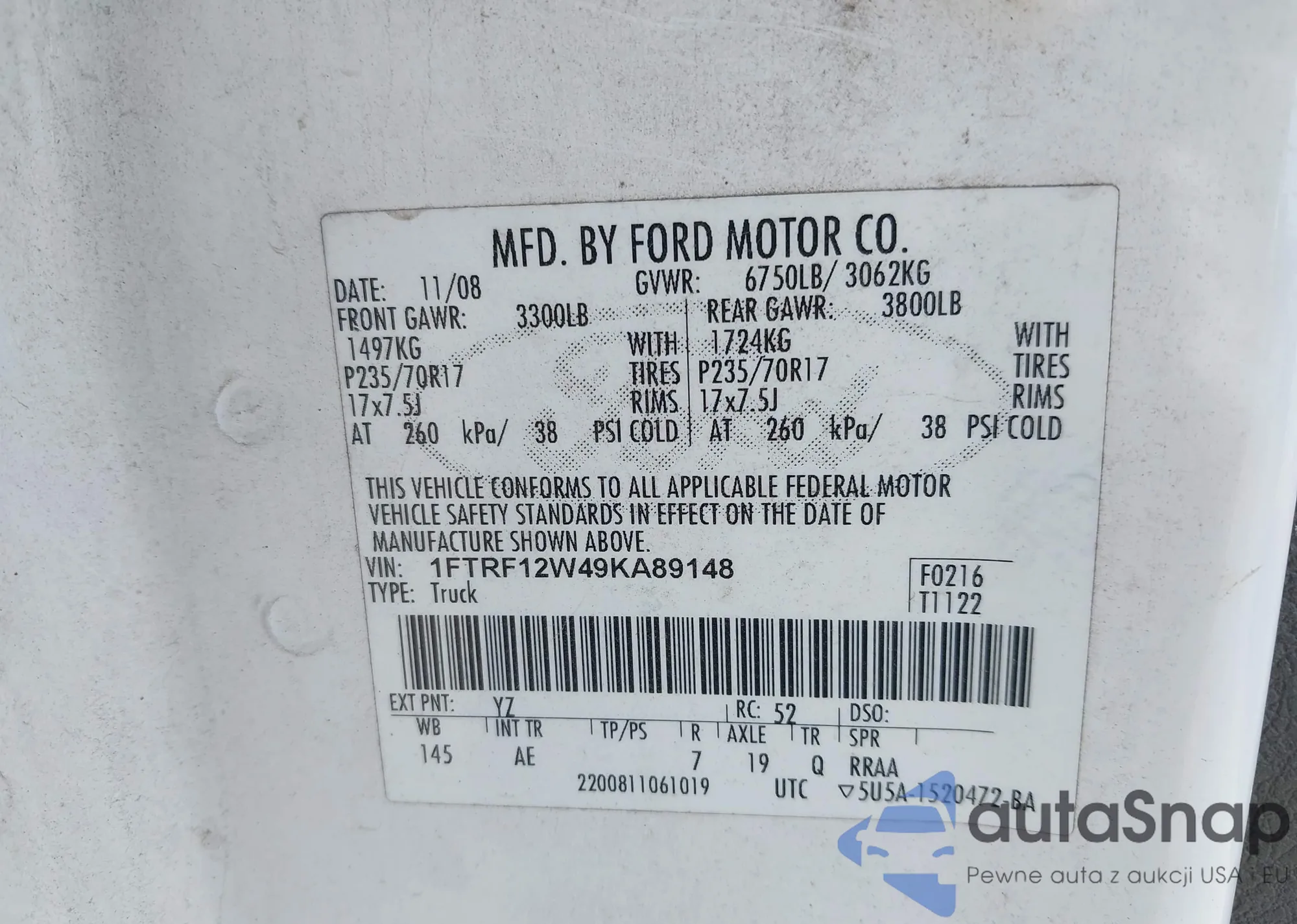 LOT: 43382054 VIN: 1FTRF12W49KA89148