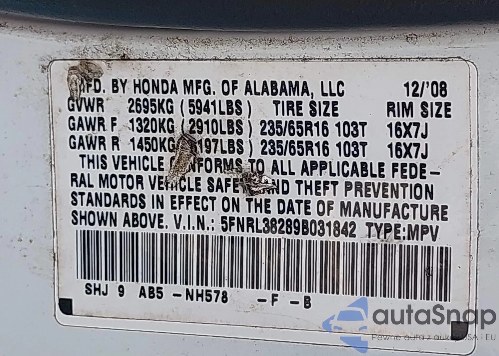 LOT: 42832764 VIN: 5FNRL38289B031842