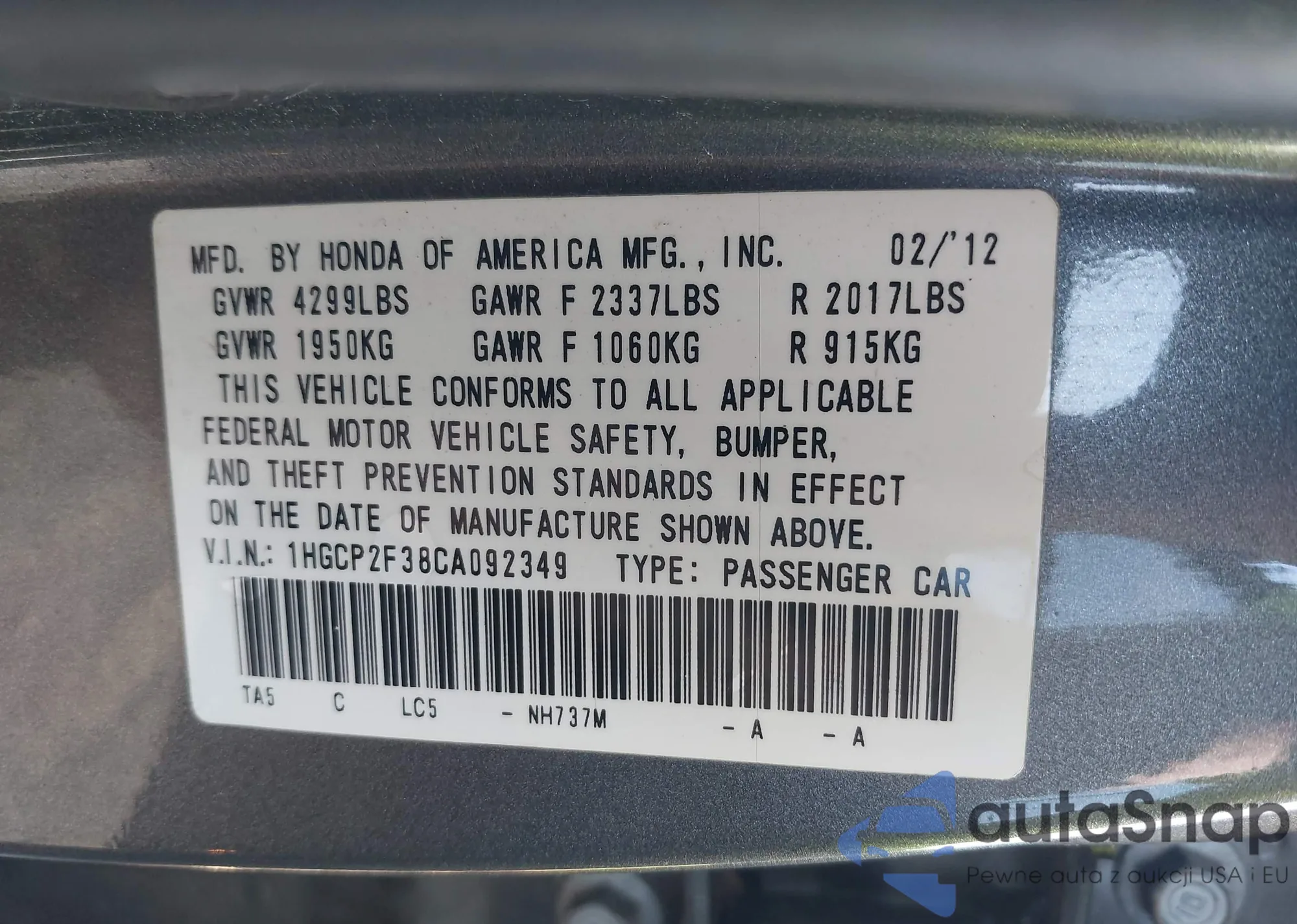 LOT: 43048566 VIN: 1HGCP2F38CA092349