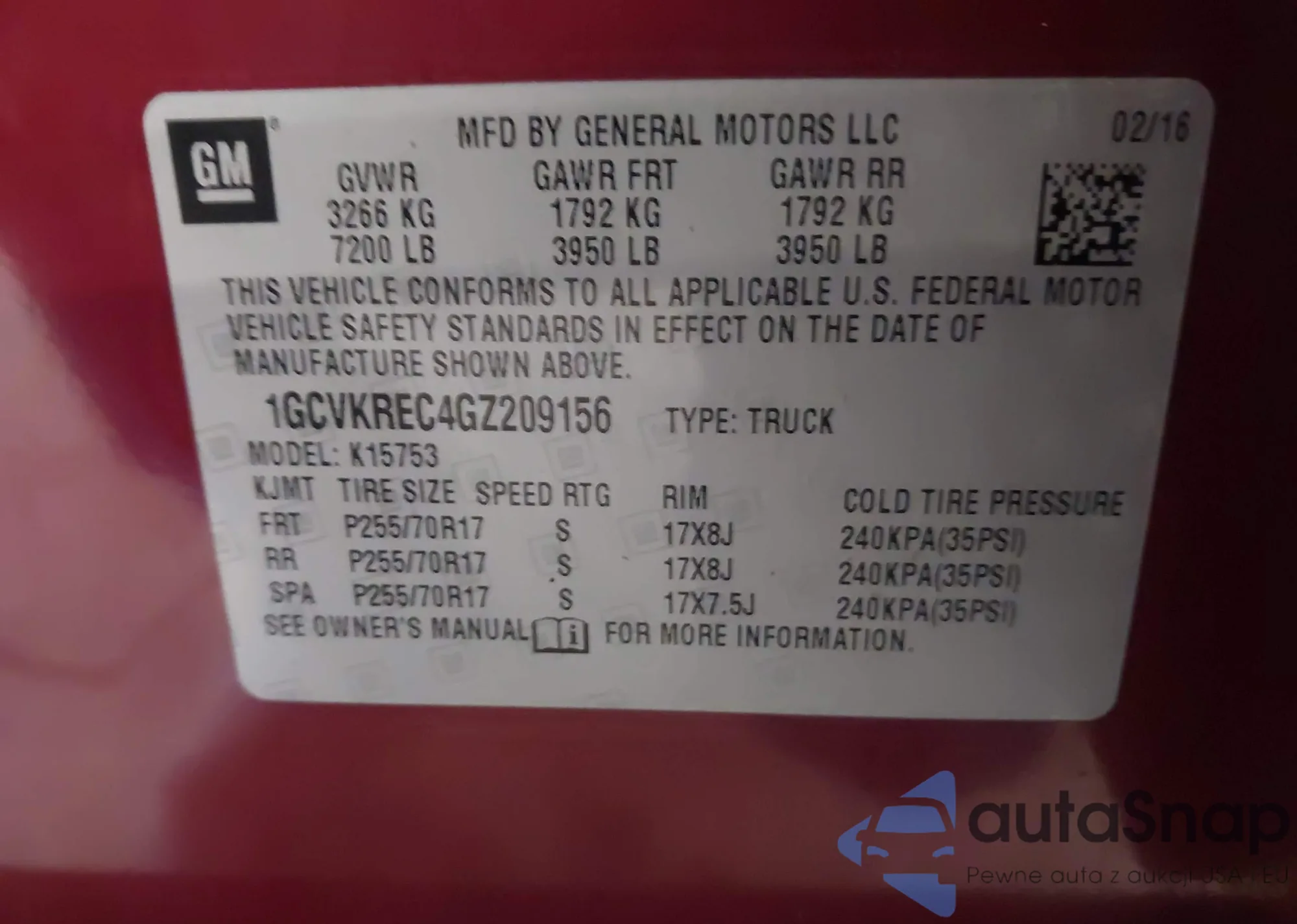 LOT: 43437637 VIN: 1GCVKREC4GZ209156