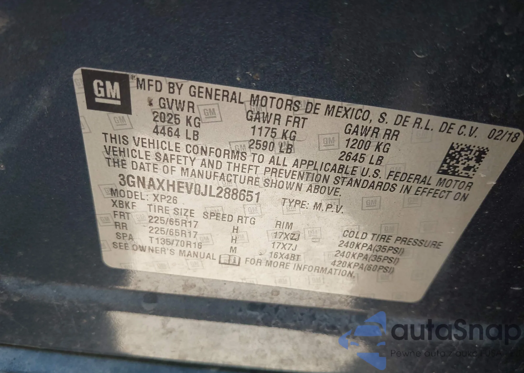 • VIN 3GNAXHEV0JL288651