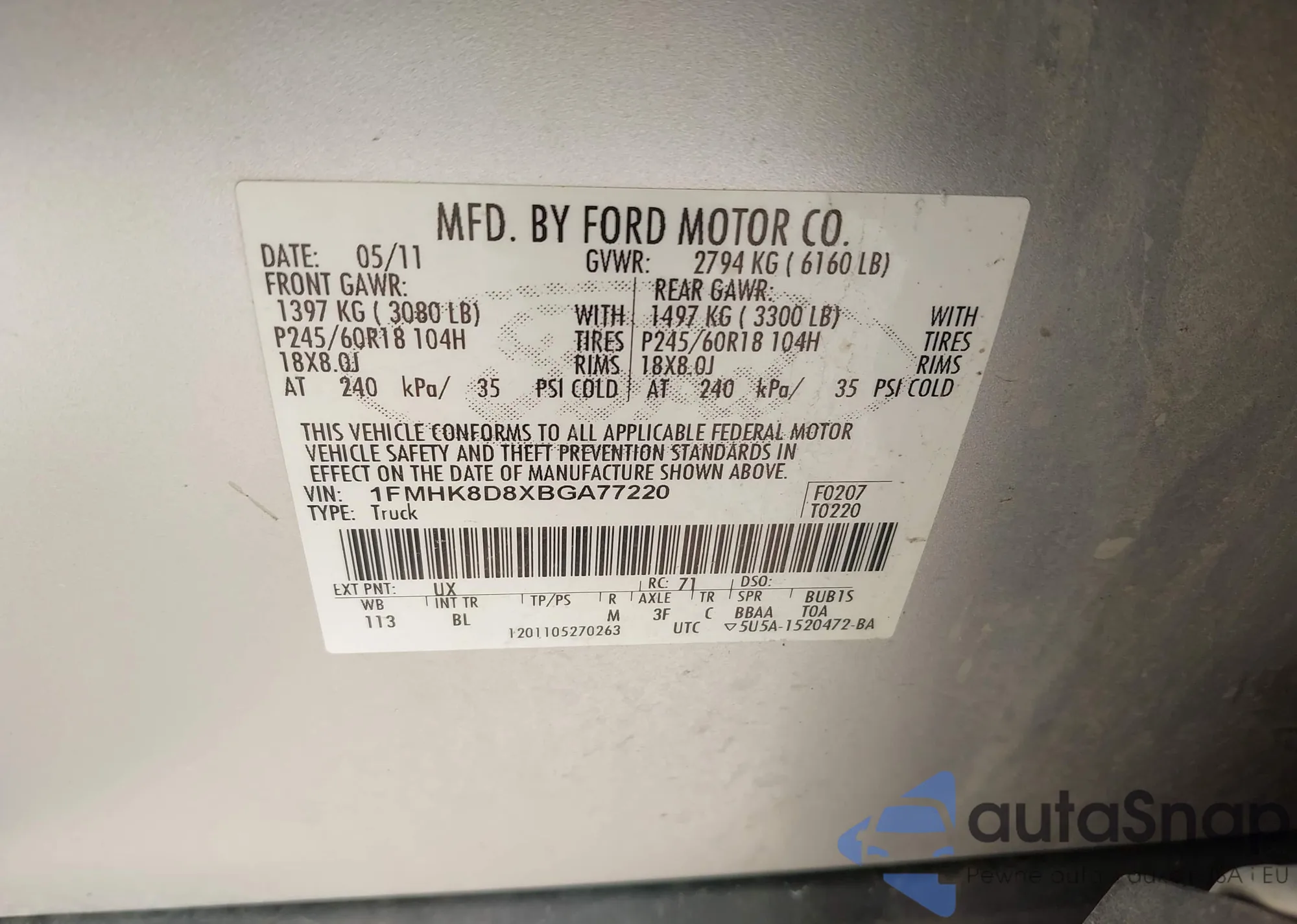 • VIN 1FMHK8D8XBGA77220