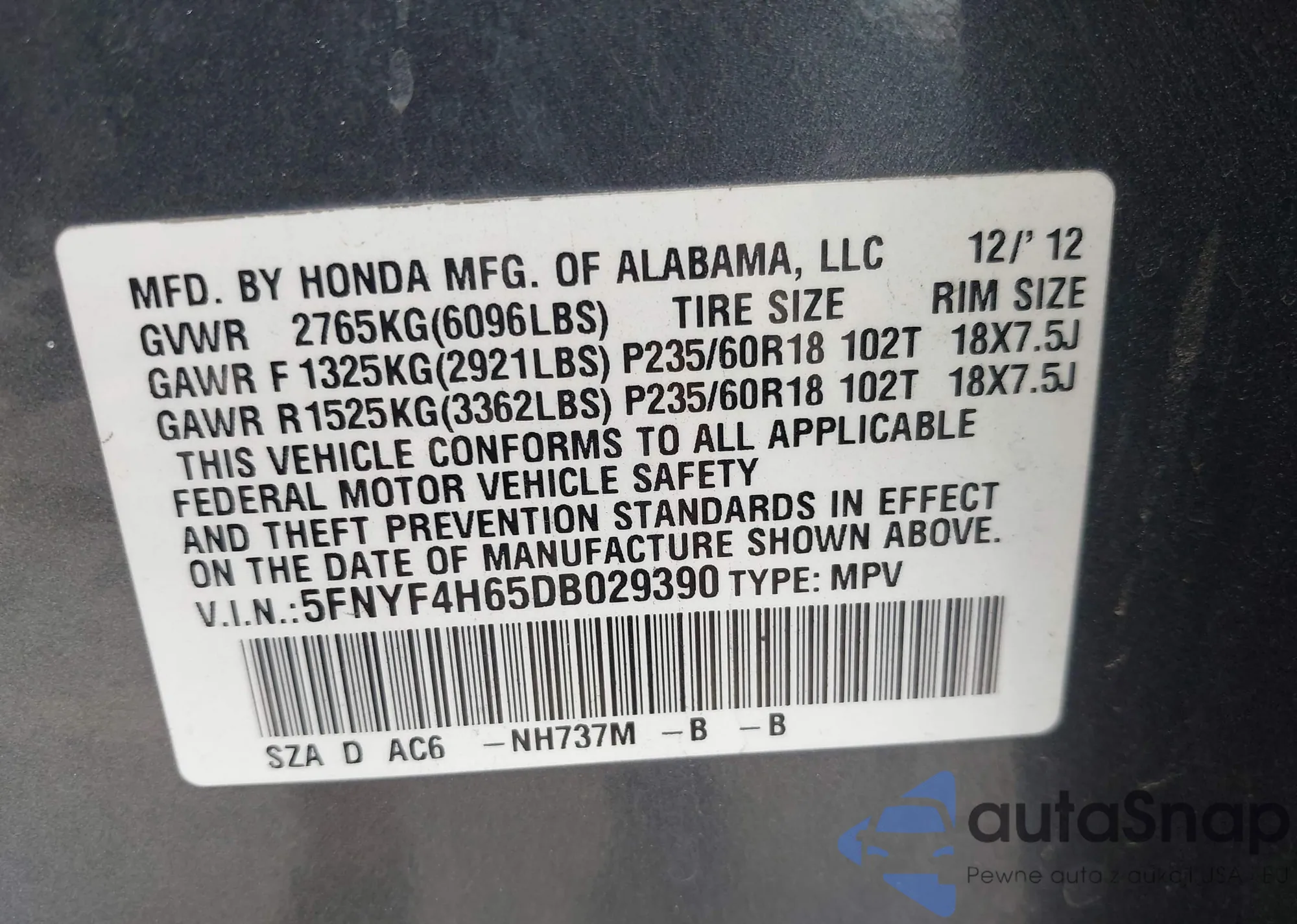 • VIN 5FNYF4H65DB029390