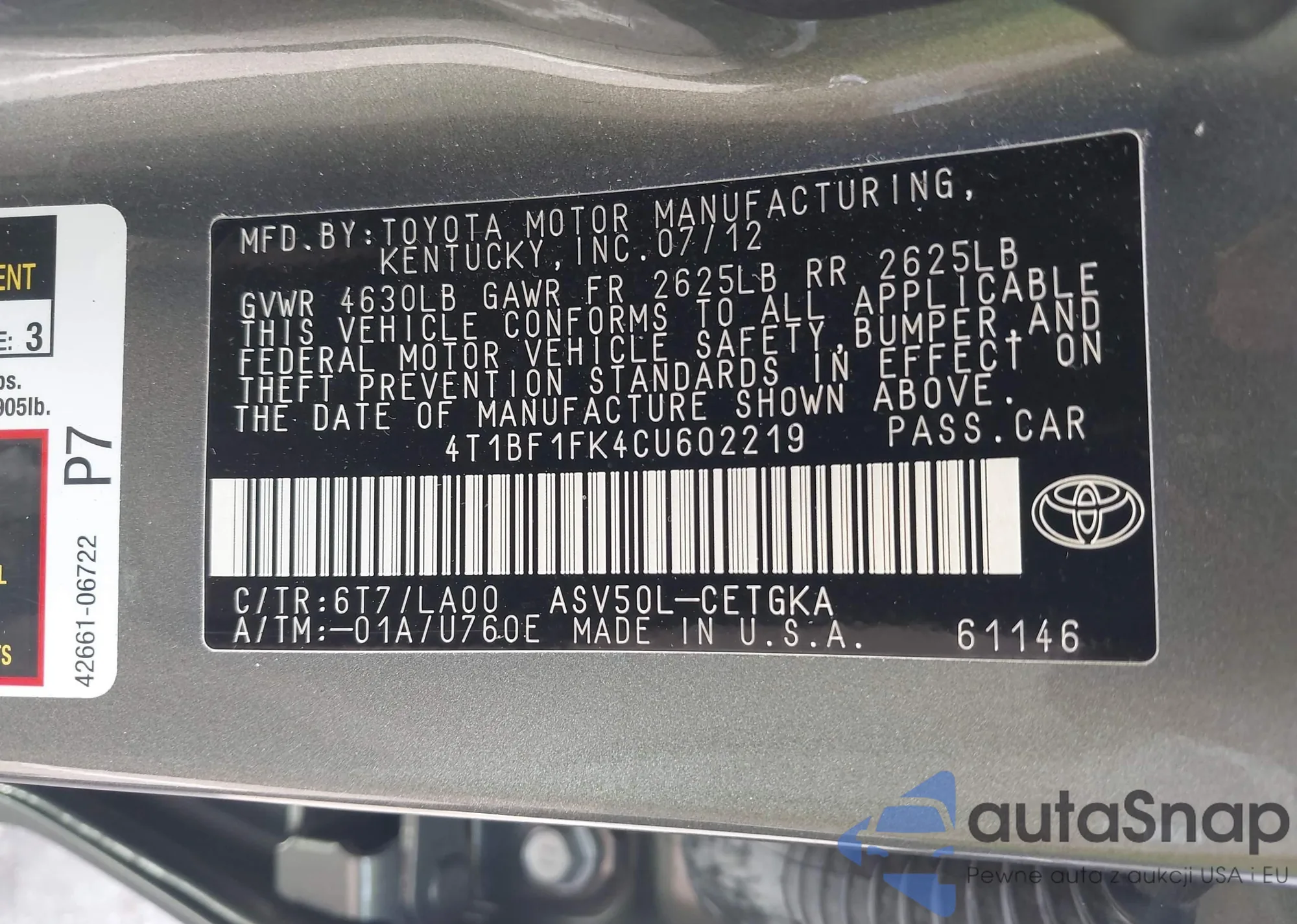 • VIN 4T1BF1FK4CU602219