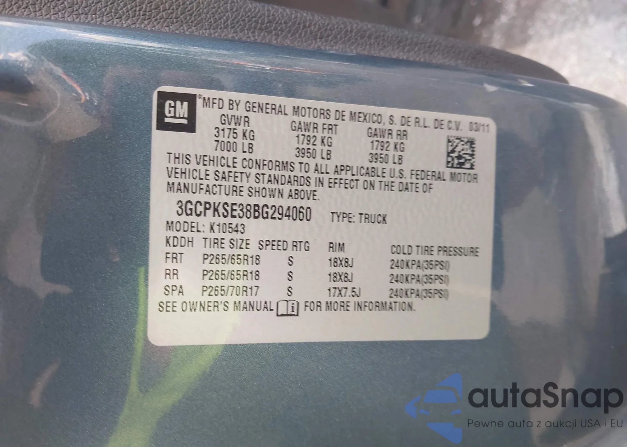 • VIN 3GCPKSE38BG294060