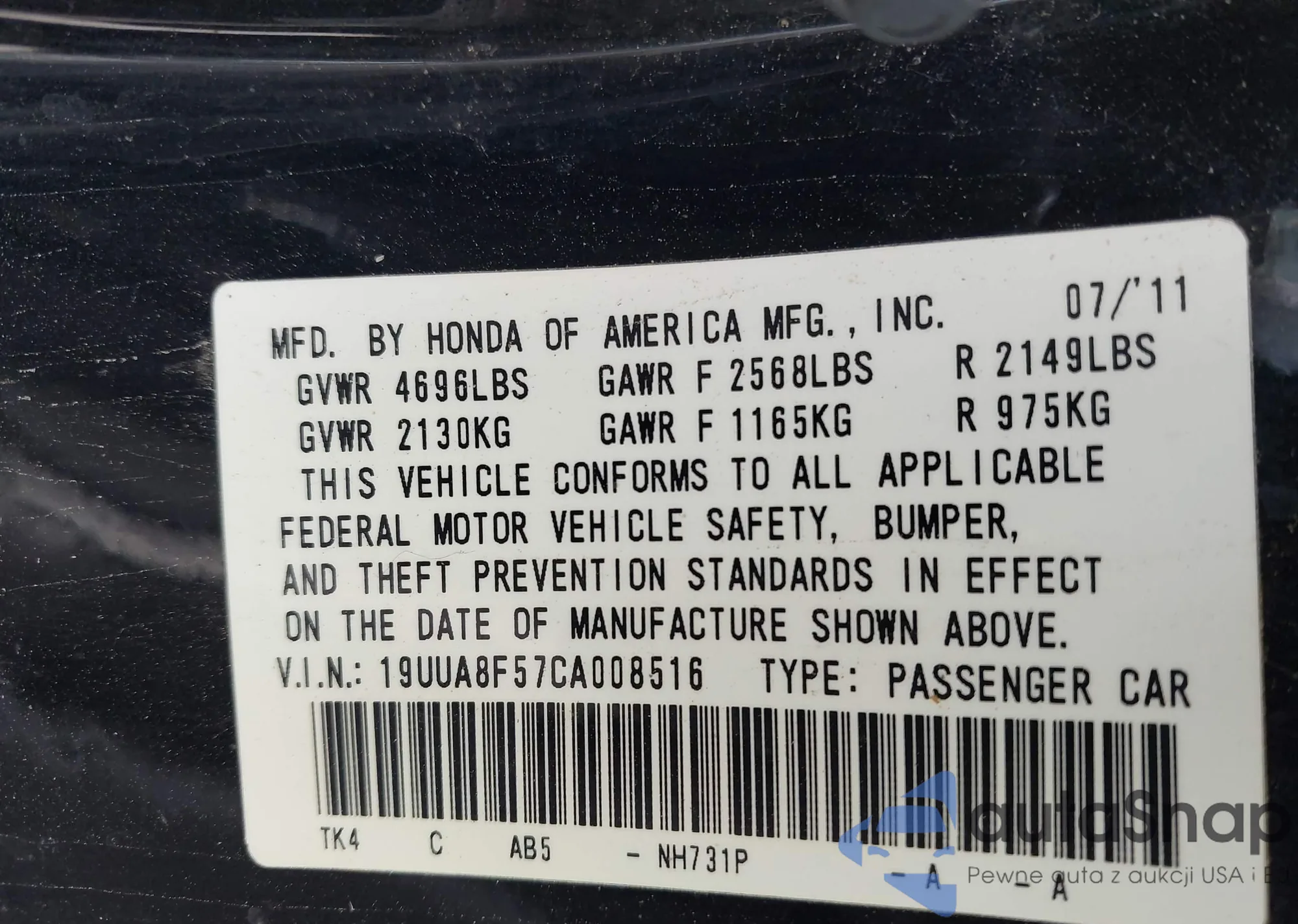 • VIN 19UUA8F57CA008516
