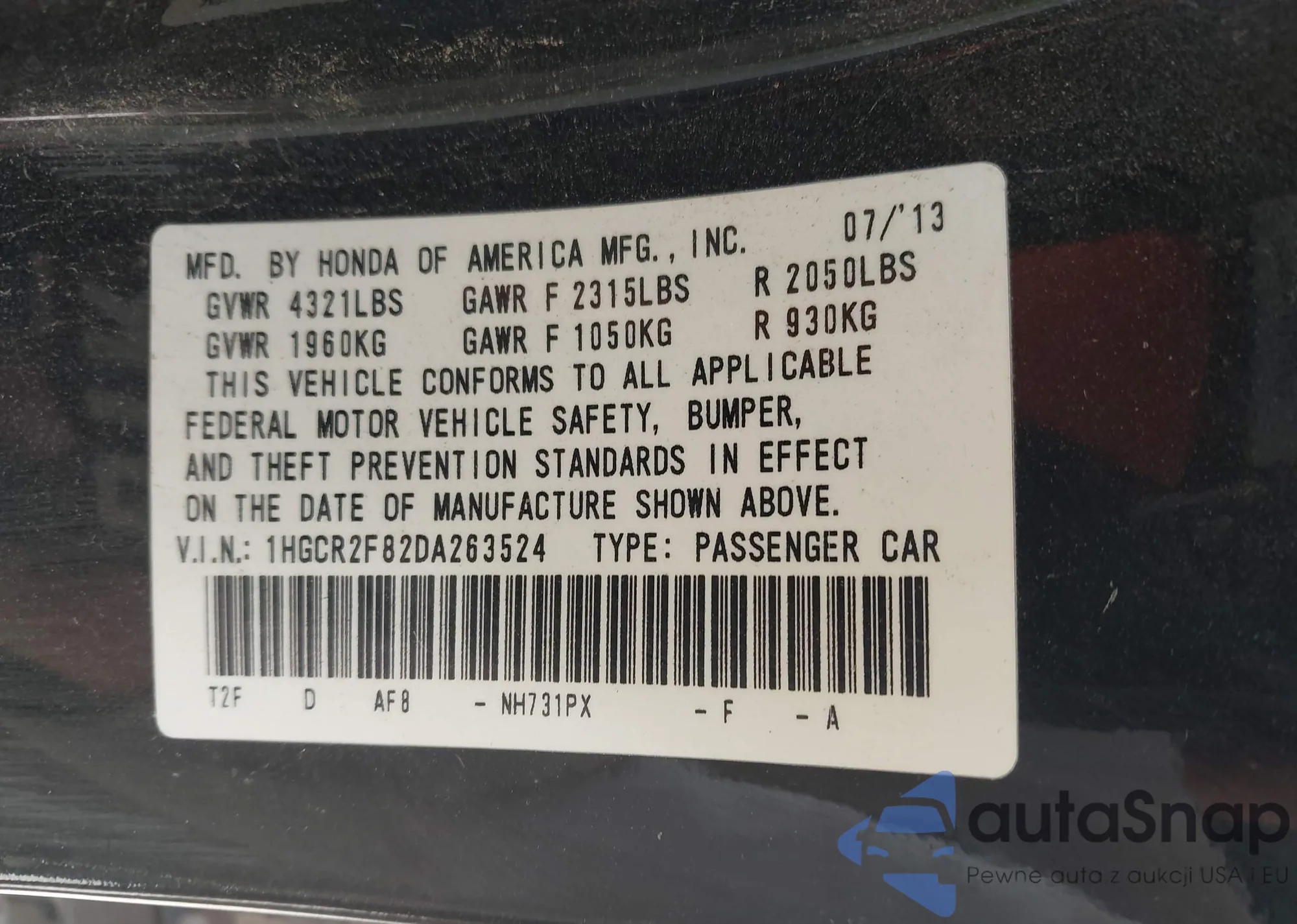 LOT: 43049965 VIN: 1HGCR2F82DA263524