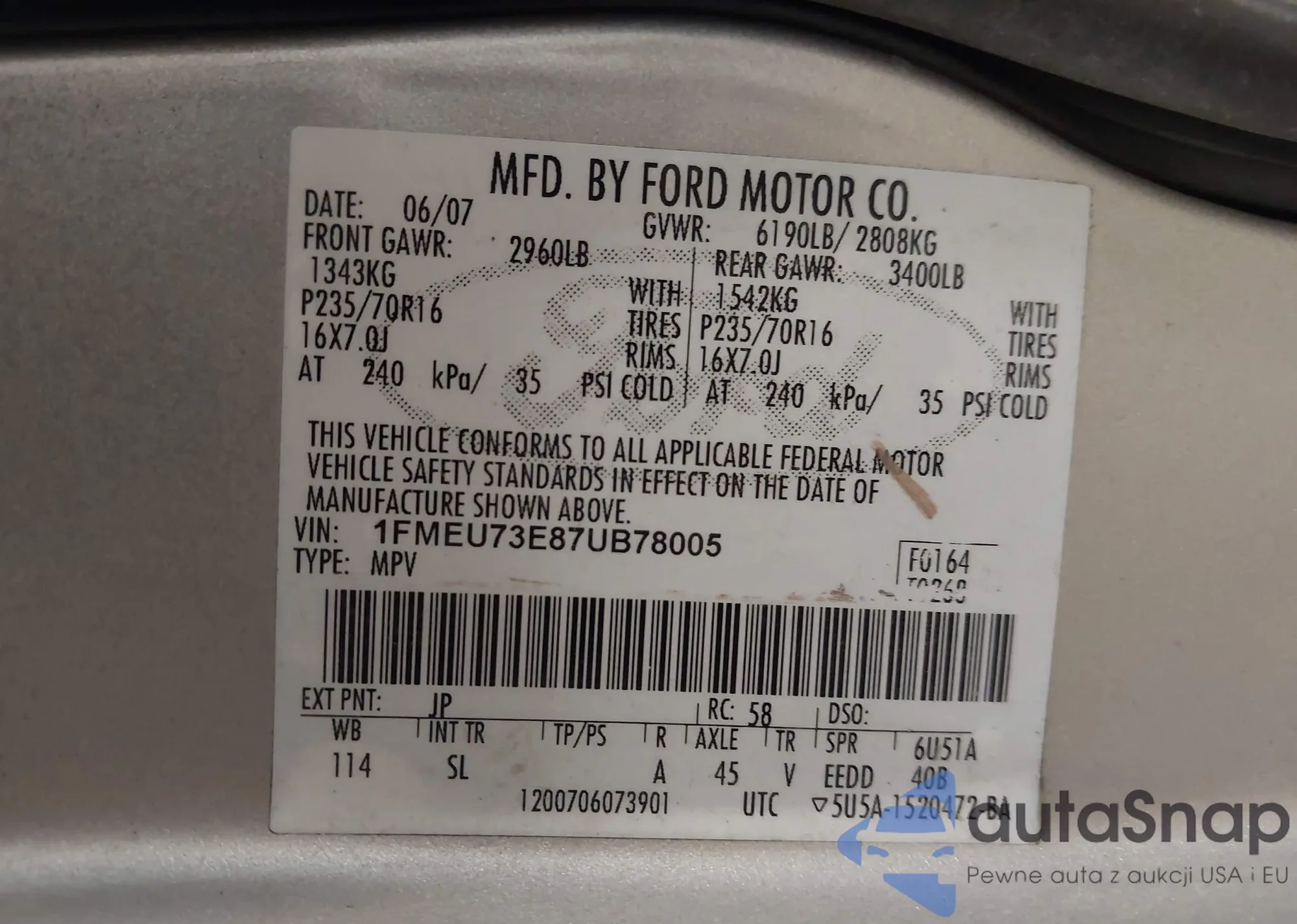 LOT: 43349725 VIN: 1FMEU73E87UB78005