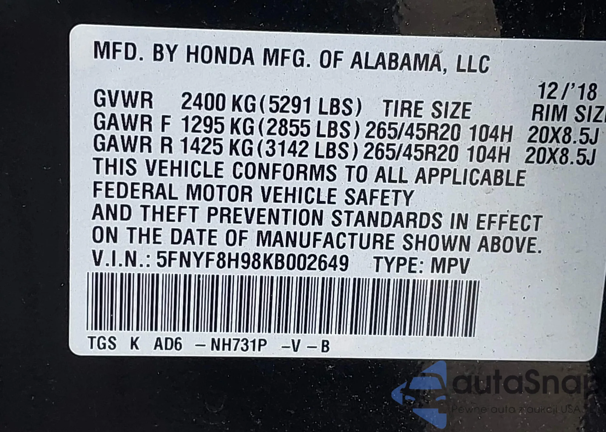 • VIN 5FNRL5H97GB051067