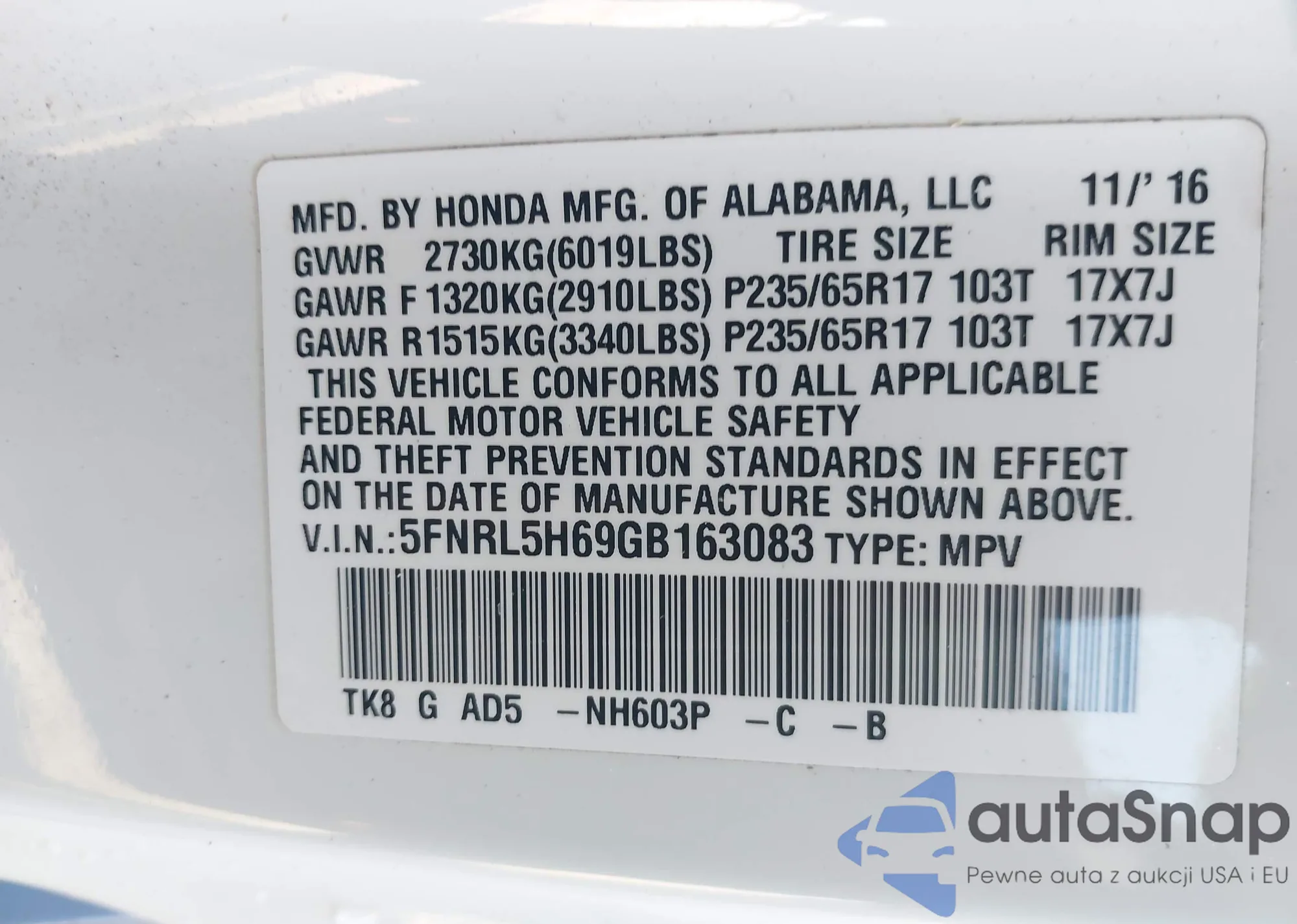 • VIN 5FNRL5H69GB163083