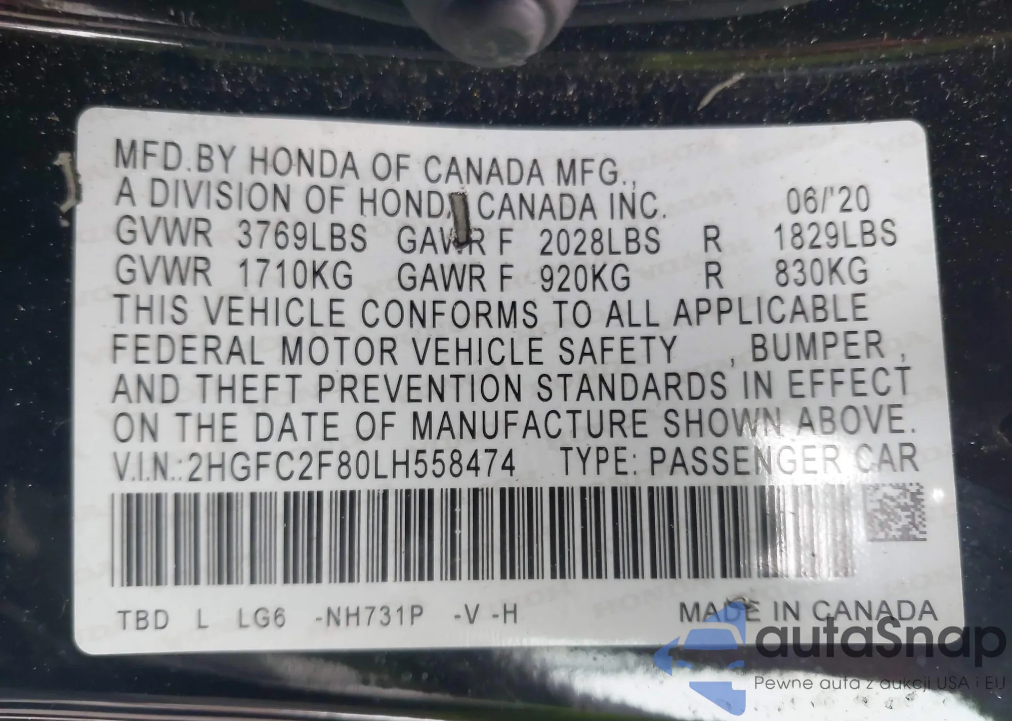 LOT: 42637951 VIN: 2HGFB6E58CH705142