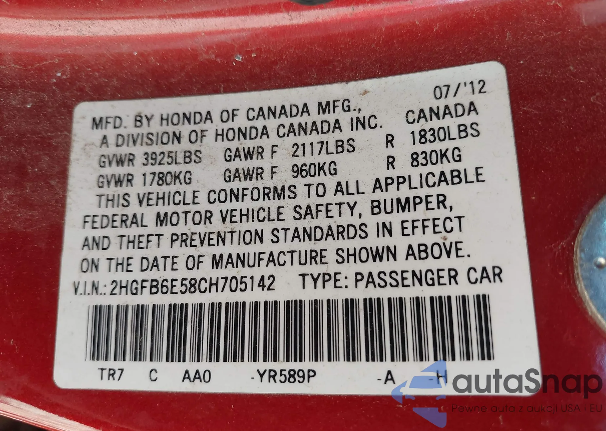 • VIN 2HGFB6E58CH705142