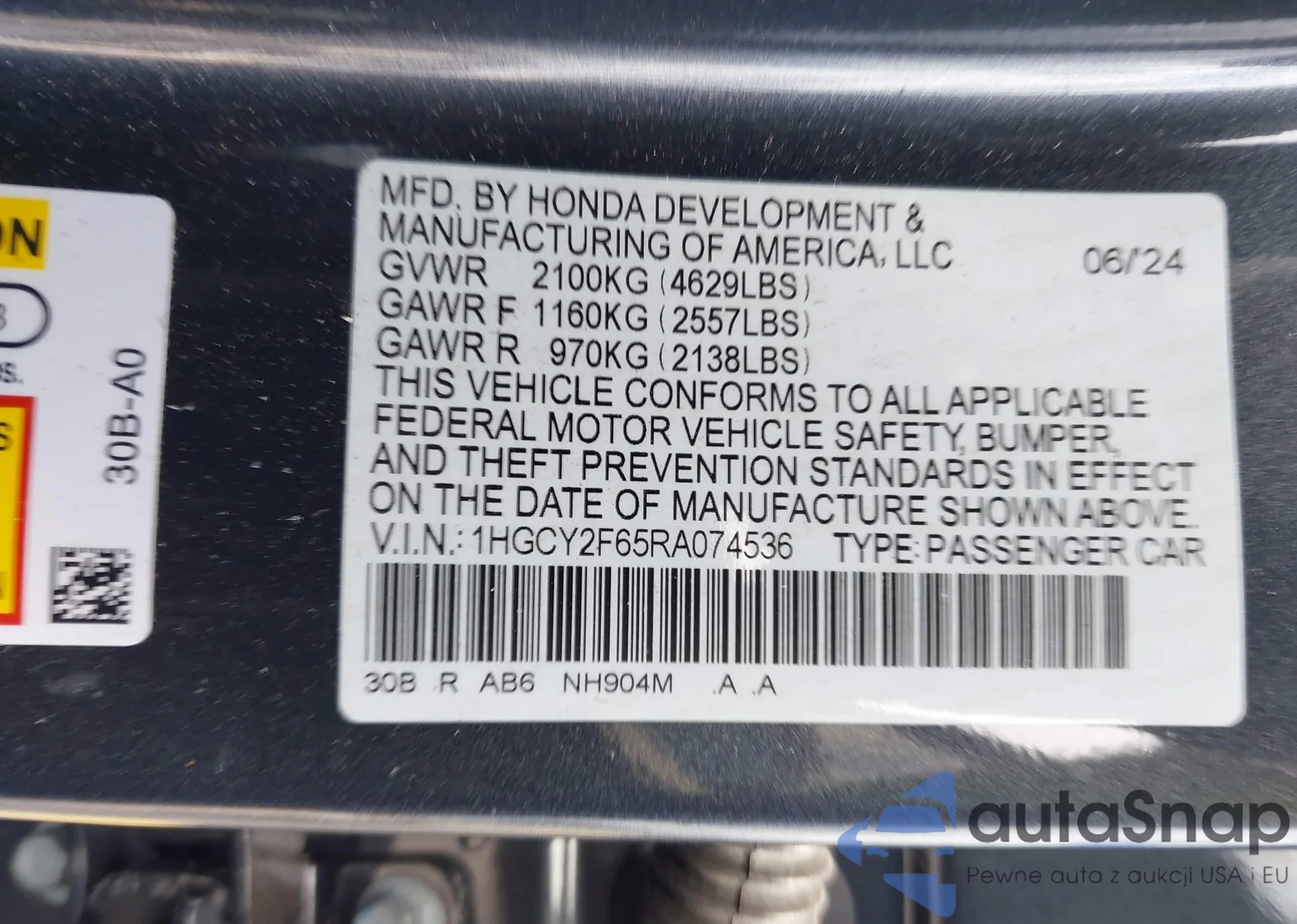 • VIN 1HGCY2F65RA074536