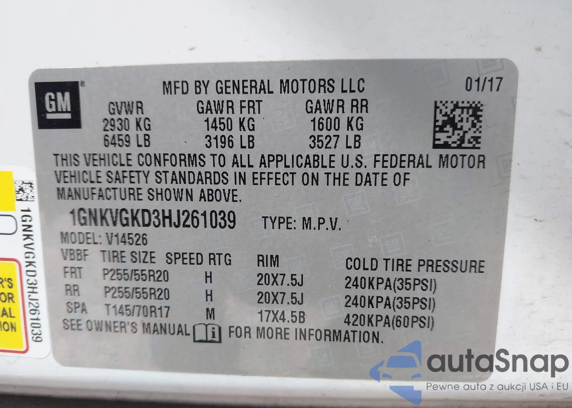LOT: 43114468 VIN: 1GNKVGKD3HJ261039