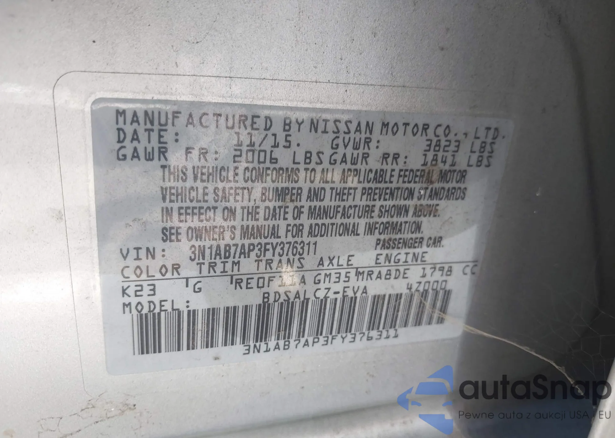 LOT: 42877017 VIN: 3N1AB7AP3FY376311