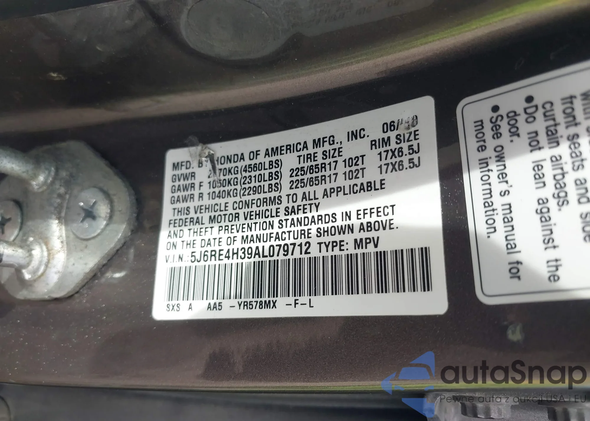 • VIN 5J6RE4H39AL079712