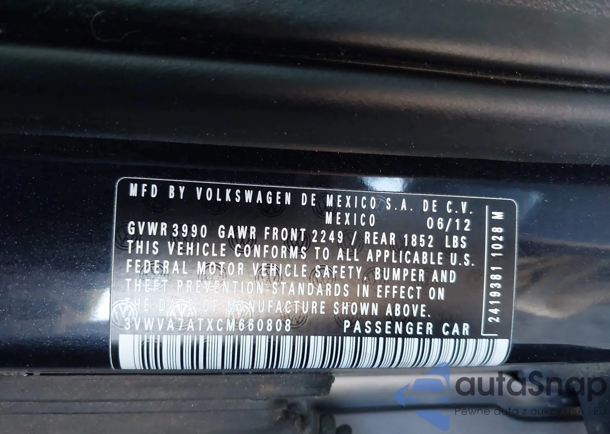 LOT: 43375792 VIN: 3VWVA7ATXCM660808