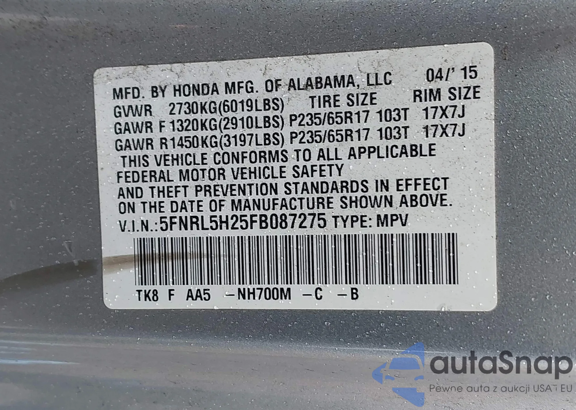 LOT: 43439381 VIN: 5J6RM4H38CL047808
