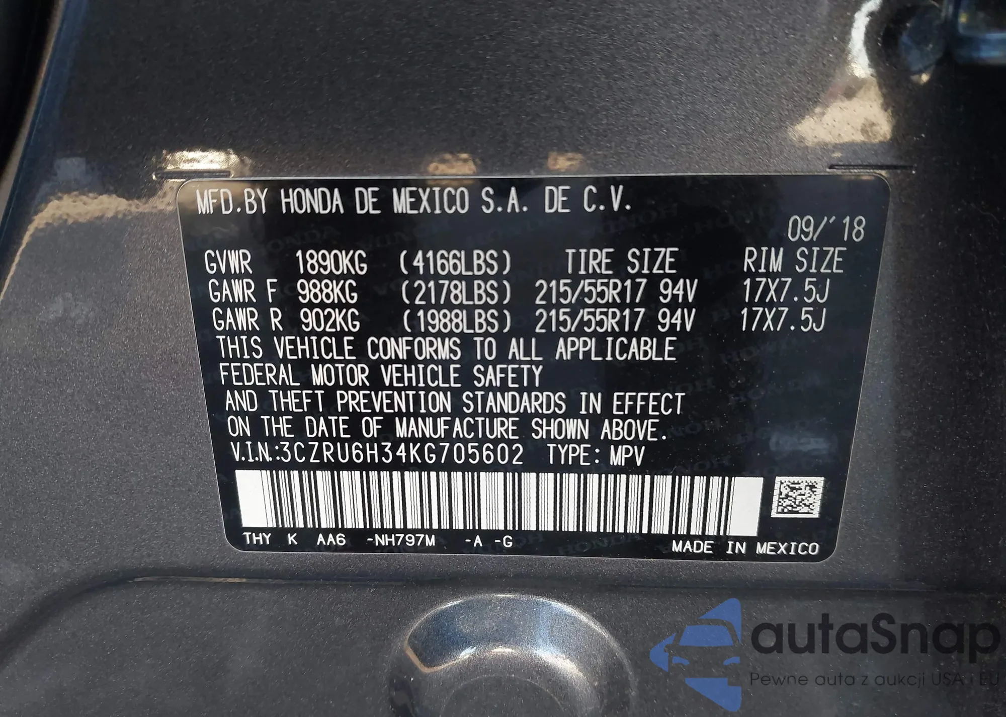 • VIN 3CZRU6H34KG705602