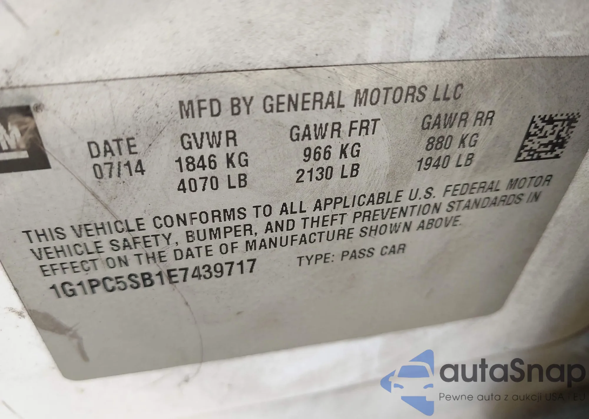 LOT: 43370886 VIN: 1G1PC5SB1E7439717