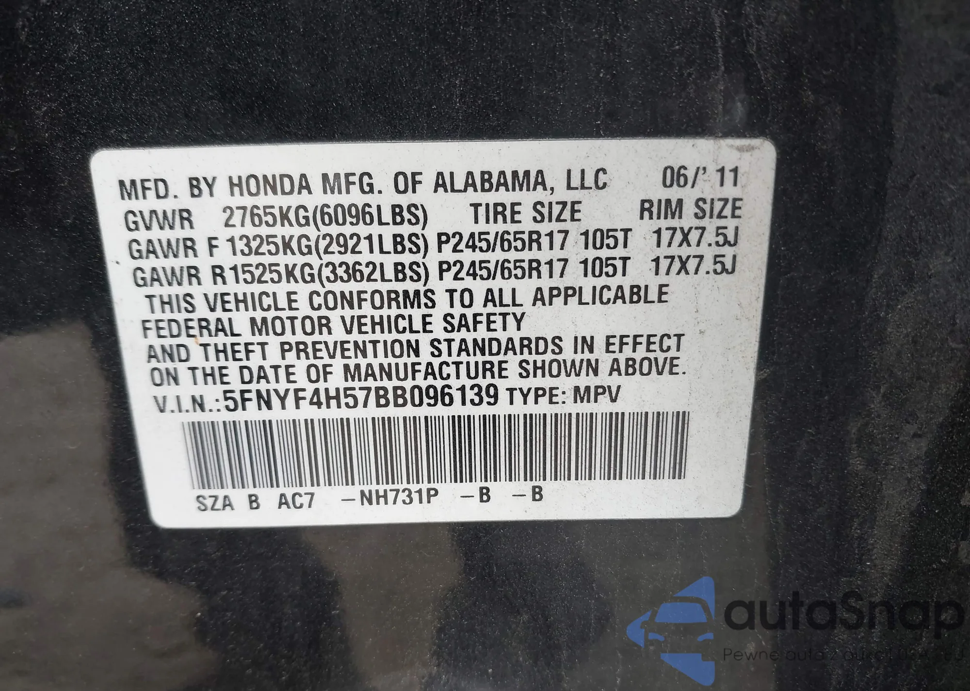 • VIN 5FNYF4H57BB096139