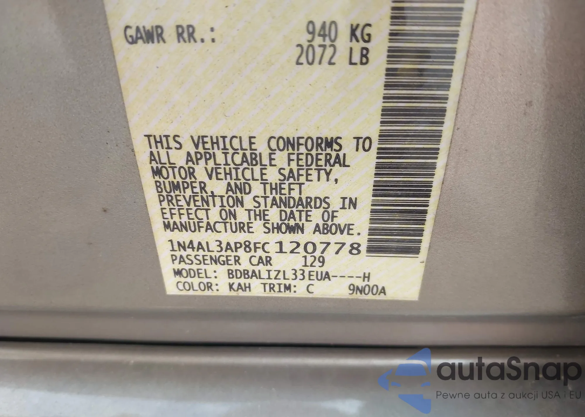 • VIN 1N4AL3AP8FC120778