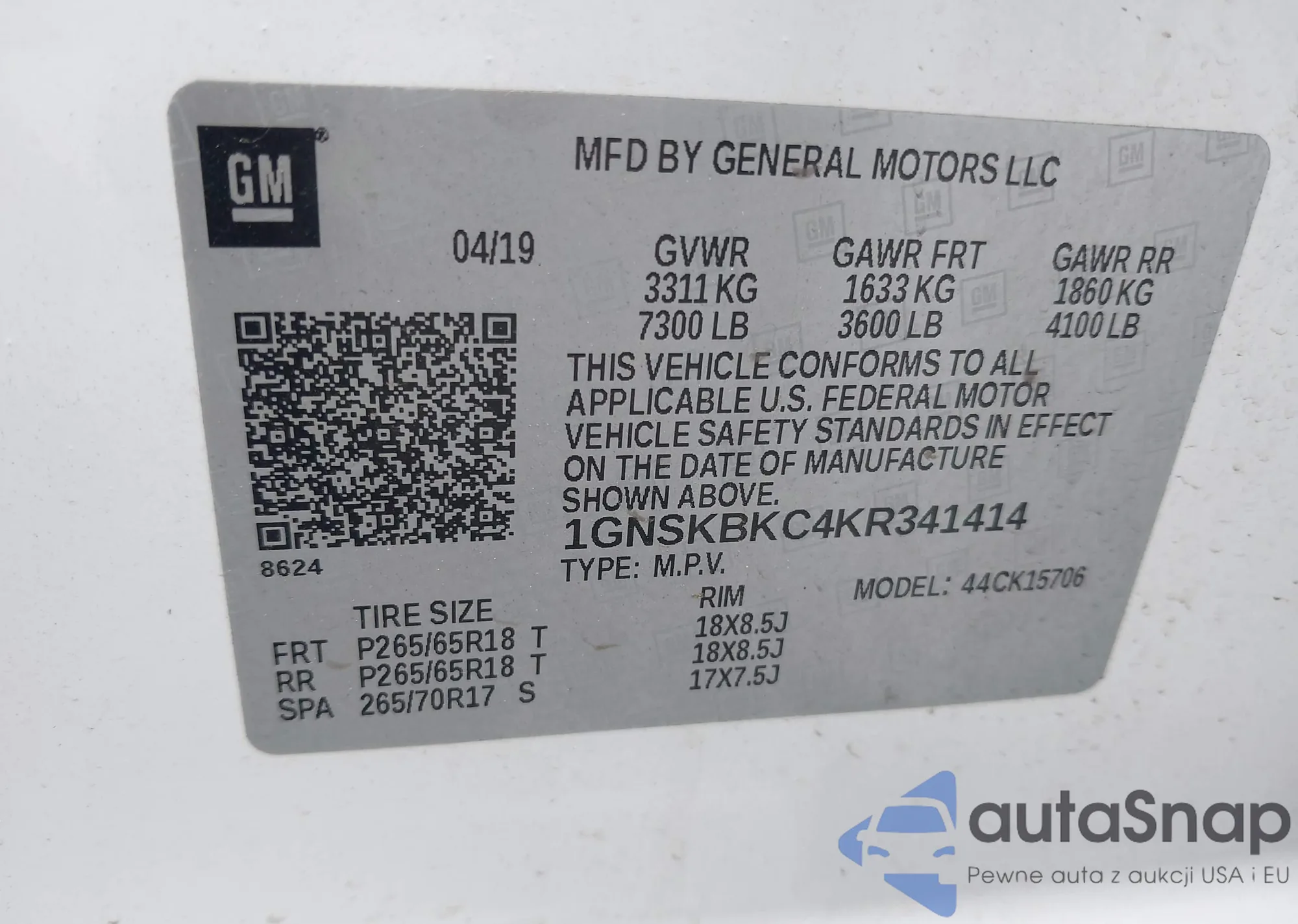 LOT: 42198777 VIN: 1GNSKBKC4KR341414