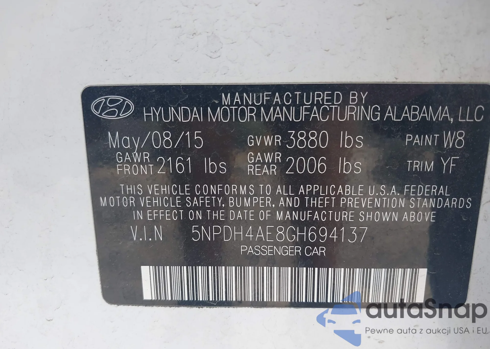 LOT: 43032057 VIN: 5NPDH4AE8GH694137