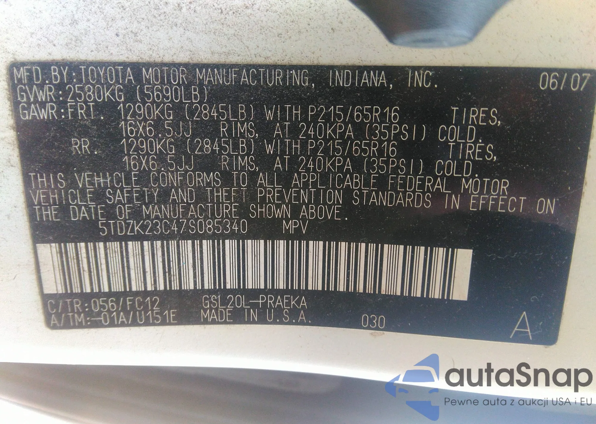 LOT: 38125702 VIN: 5TDZK23C47S085340