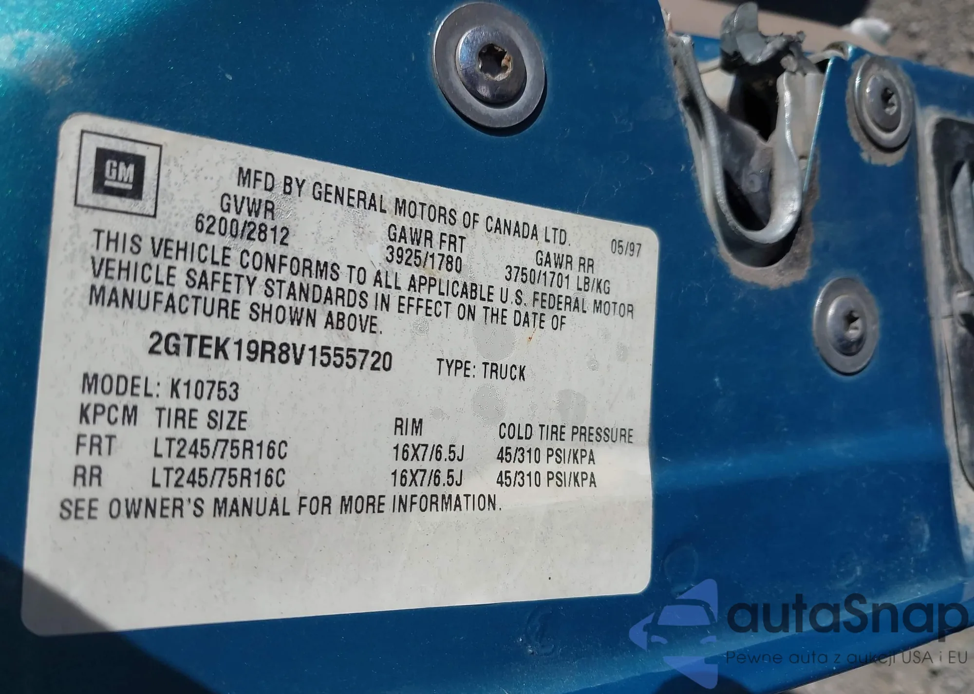 • VIN 2GTEK19R8V1555720