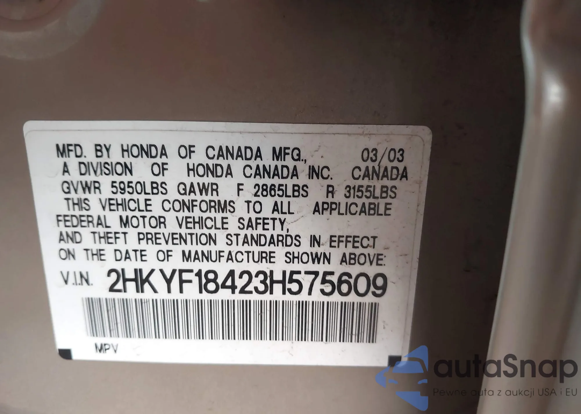 LOT: 43520928 VIN: 2HKYF18423H575609
