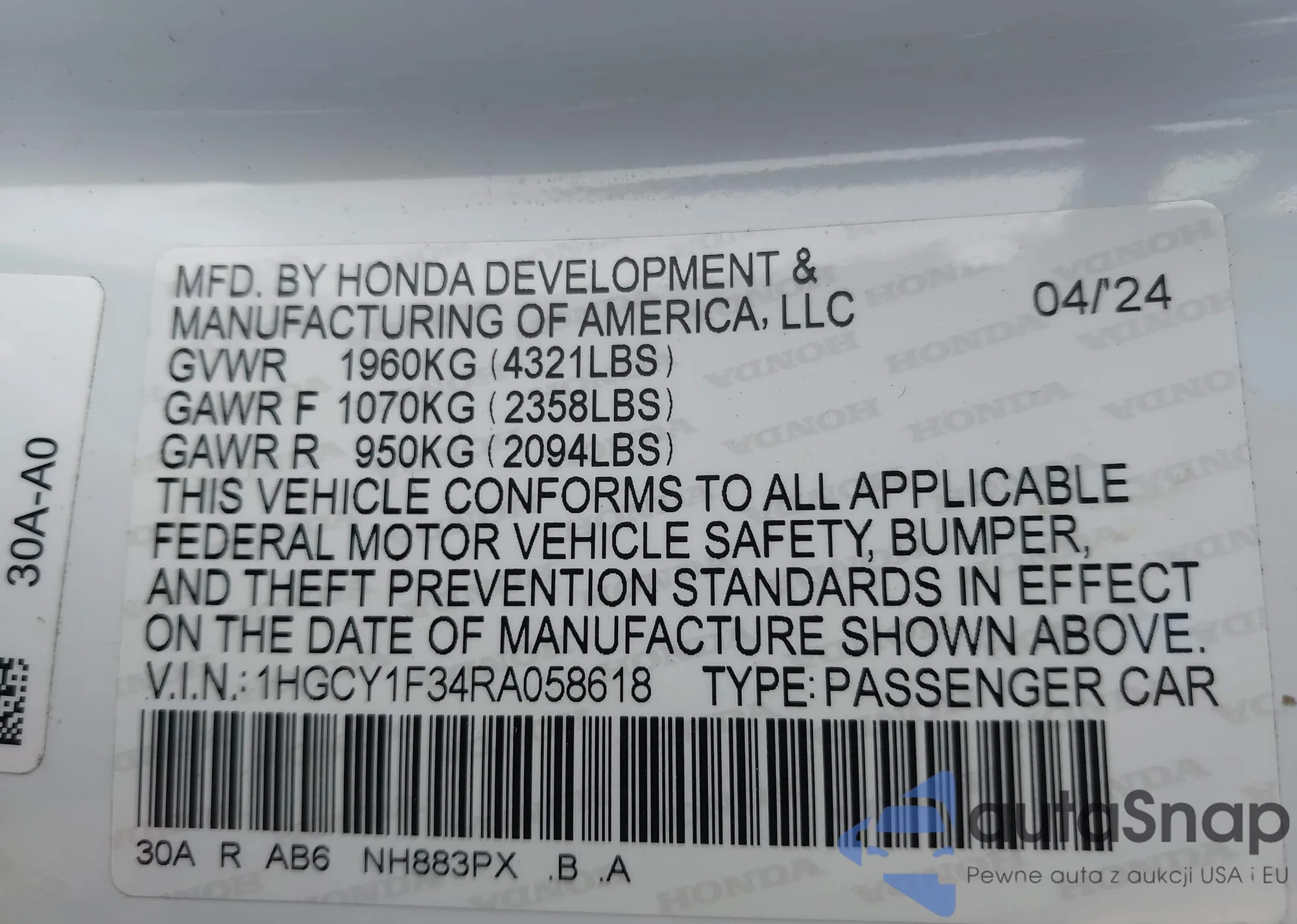 • VIN 1HGCY1F34RA058618