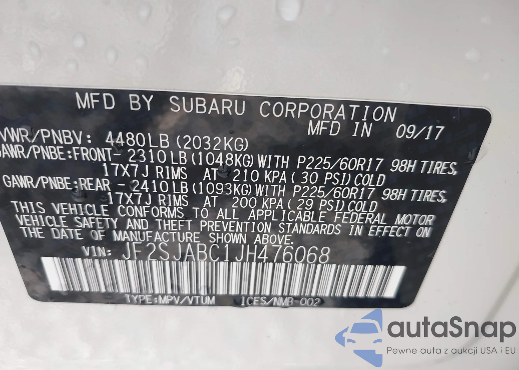 LOT: 43418881 VIN: JF2SJABC1JH476068